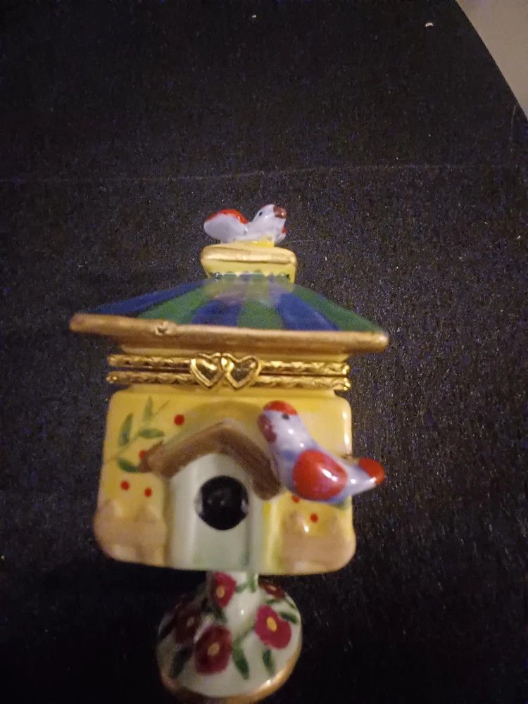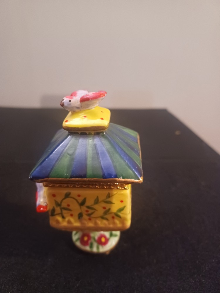 The product is a Bird brand trinket box in a multicolor design, featuring a bird subject. The trinket box resembles a bird house, making it a charming and decorative piece for storing small items.
