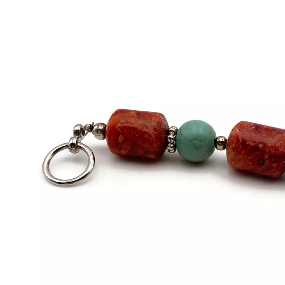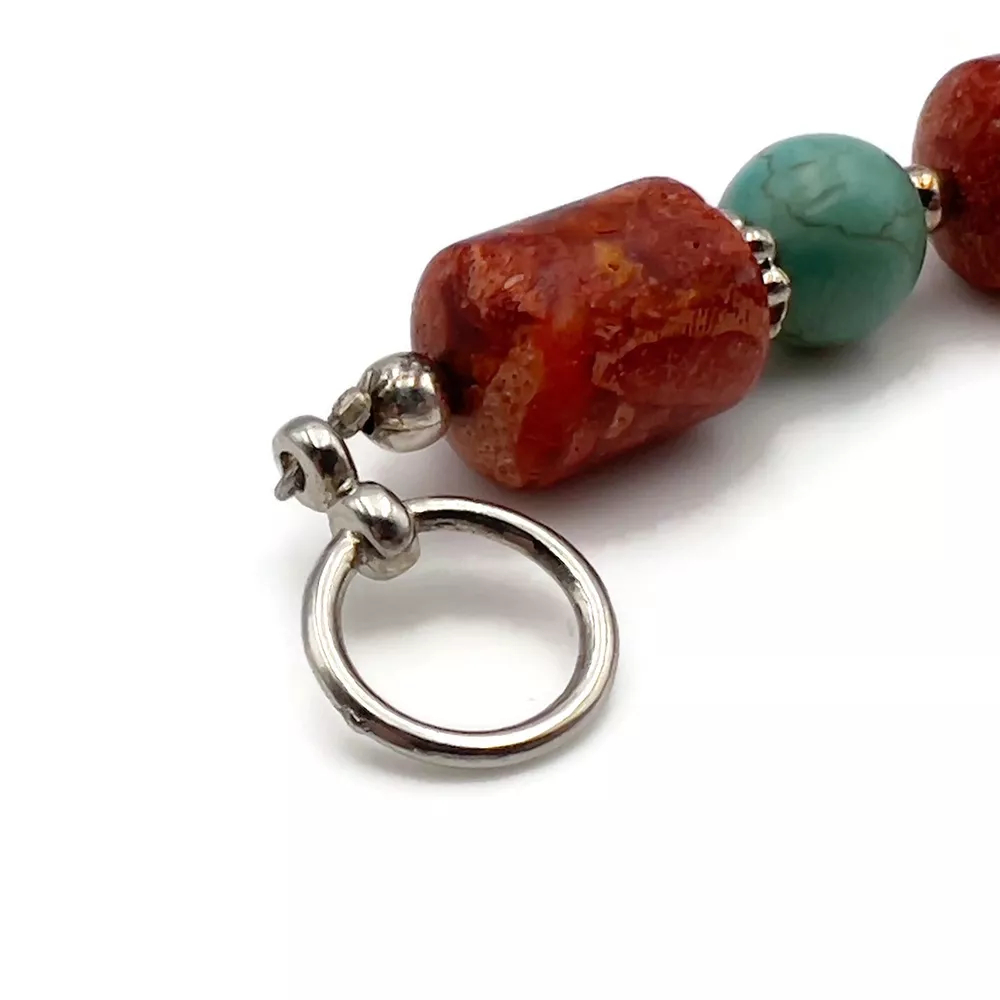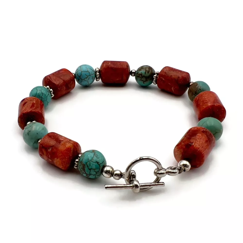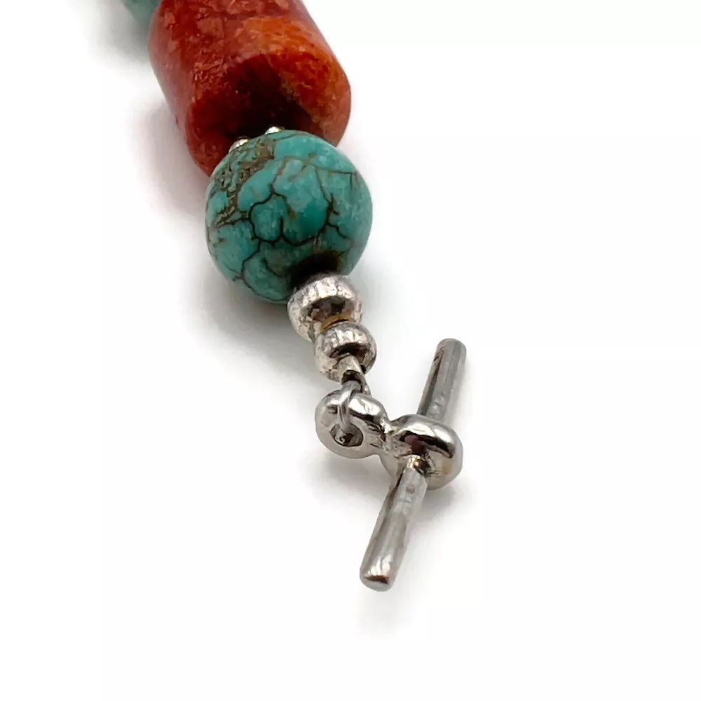 Enhance your wrist with this stunning handcrafted beaded bracelet. The bracelet features silver tone metal and red and blue jasper stone beads, giving it a unique and eye-catching look. The toggle clasp provides a secure and comfortable fit for a wrist circumference of 7.5 inches, with a total length of 9 inches. This artisan bracelet is perfect for women who love beaded and bohemian-style jewelry. The beads range in size from 3.62mm to 14.21mm x 10mm, and the bracelet is made in the United States of America. Elevate your fashion with this one-of-a-kind piece that is perfect for any occasion.