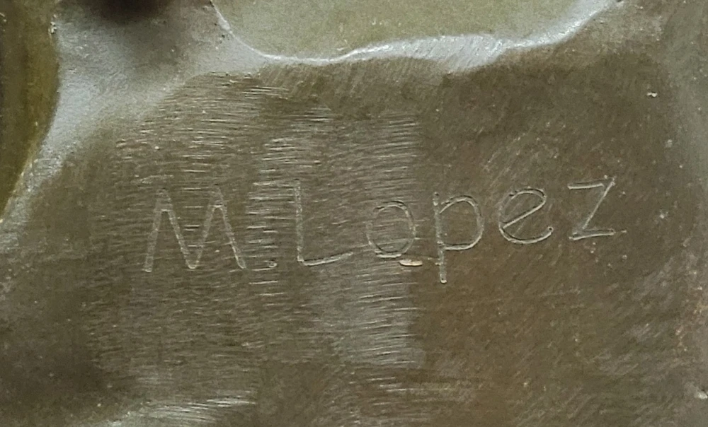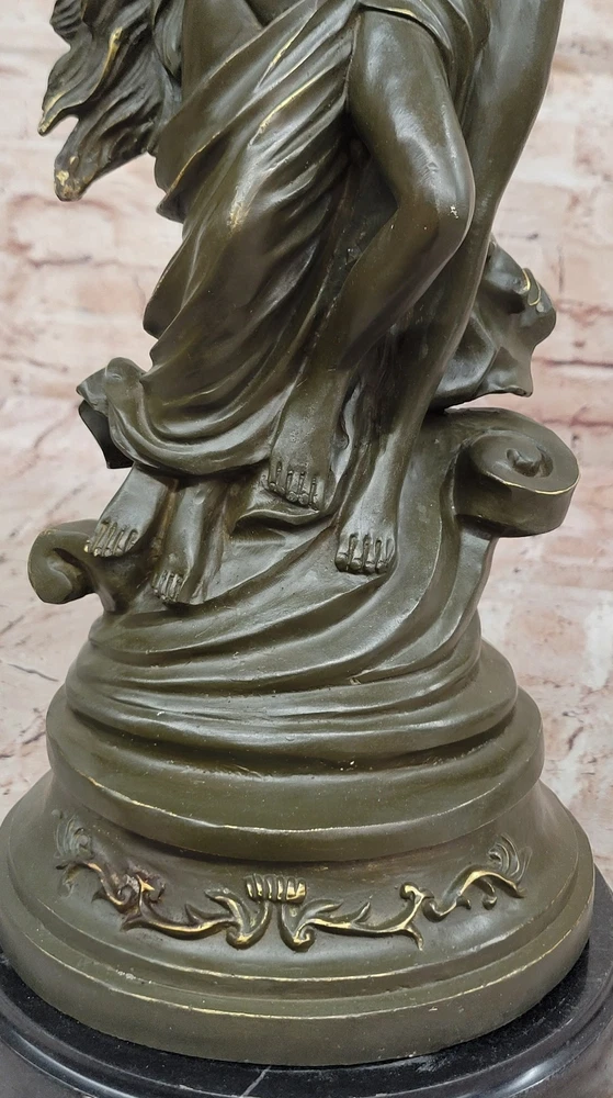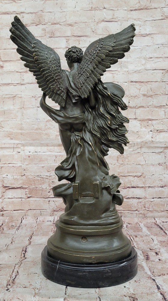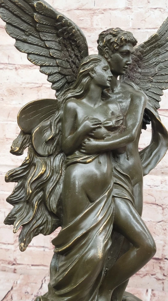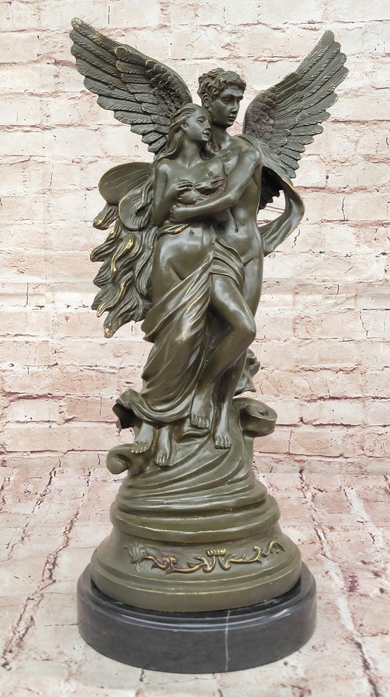 Handcrafted Eros & Psyche Bronze Statue – Love and Soul Greek Myth Figurine Gift Handcrafted Eros & Psyche Bronze Statue – Love and Soul Greek Myth Figurine Gift Condition : This sculpture is in perfect condition. Bronze Dimensions with Marble Base: Height 20.5" X Width 10" Marble Dimensions: Diameter 8" Height without base:19" Weight:21 LBS Inventory:35GTS85211753 This magnificent bronze statue of Eros and Psyche, designed by Miguel Lopez, also known as Milo, captures the timeless beauty and passion of Greek mythology’s most romantic tale. Eros, the god of love, embraces Psyche, the mortal woman who captured his heart, in a graceful and tender moment of divine affection. Handcrafted using the ancient lost wax method, this sculpture showcases extraordinary detail and flowing forms, from the delicate curvature of their bodies to the emotional expression conveyed in their faces. The piece is finished in a deep brown patina, enhancing its classical allure and timeless elegance. This large-scale artwork is mounted on a round black marble base, providing a sturdy foundation and contrasting beautifully with the warmth of the bronze. Signed by the artist, it makes a stunning statement in any fine art collection, classical décor, or romantic setting. Shipping Terms : Most of our items are shipped via USPS (United States Postal Service) mail or UPS. Most orders are shipped within 24-48 hours of purchase. Please be aware that not all items are available for USPS shipping due to size and weight. We do ship to Hawaii, Alaska, Canada, Puerto Rico, APO/AE, and U.S. Virgin Islands, however, an additional charge may be required. Please contact us before making any purchases in these areas. For Non-USA customers, you may be responsible for all duty, tax, brokerage fees that may be due upon delivery (shipping costs cover freight charges only). We also ship internationally. Please refer to the "Shipping and Handling" chart for the rates for each area. Payment : We accept just about any form of payment. PayPal, Master Card, Visa or American Express credit cards. Money orders, cashiers checks, and even personal or business checks. For governmental institutions, we will also accept a purchase order. Please understand that for personal or business checks we have to wait for the check to clear (usually 7 days) before shipping. Condition : New Detailed Hand Crafted Hot Cast Bronze Satisfaction Guaranteed. This is Stock Photo, Slight Color Variation!! Listing and template services provided by inkFrog