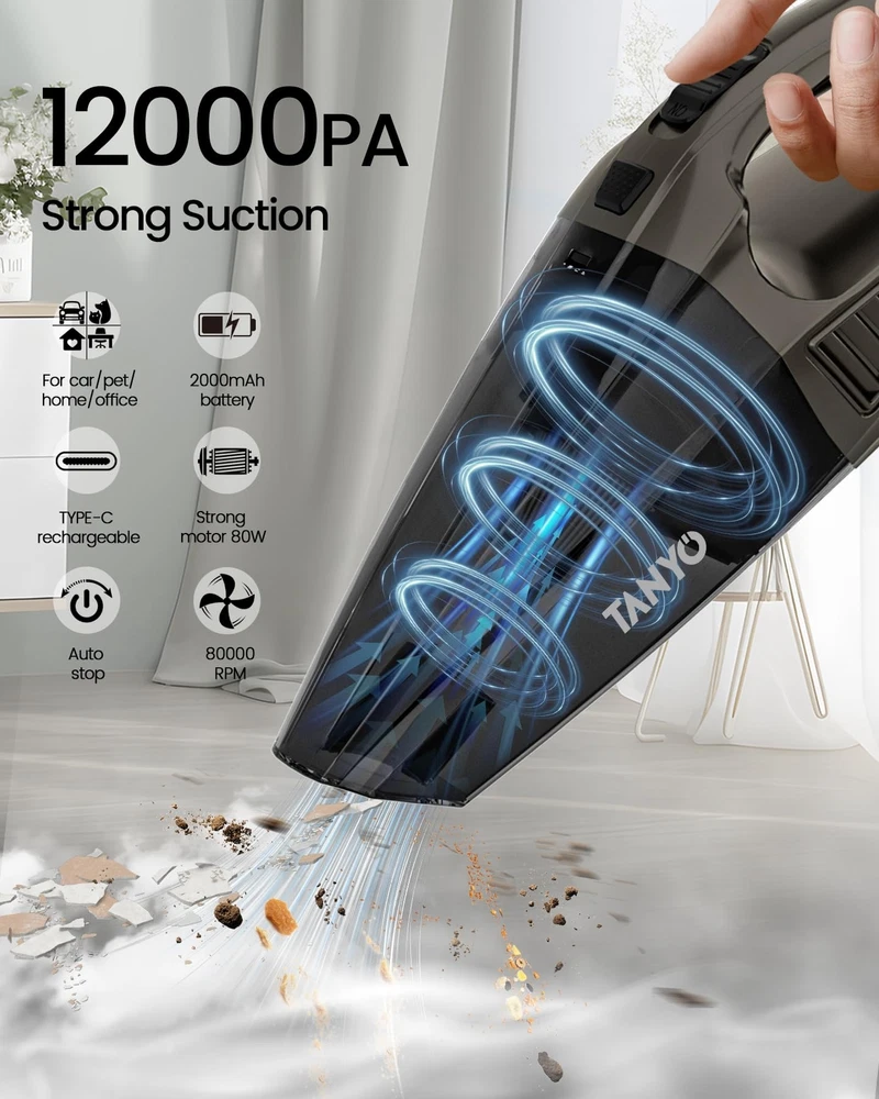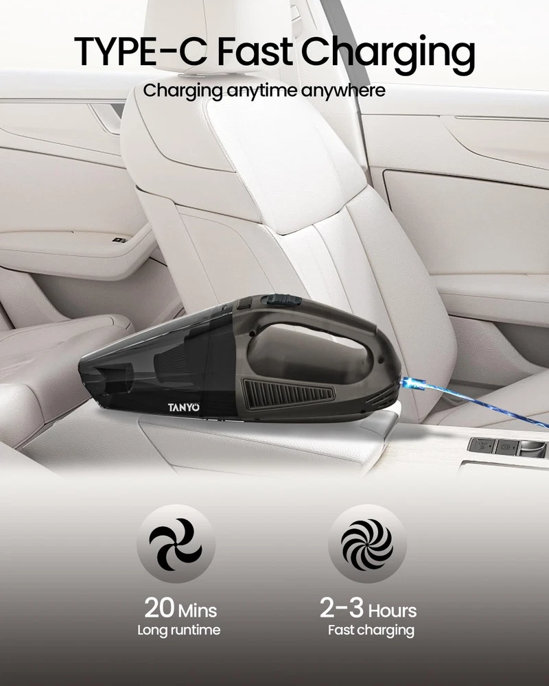 Power Suction & Brushless Motor: FA15BS handheld vacuum features an updated brushless motor with a suction power of 12000 Pa (Max mode). With a suction speed of up to 80,000 r/min, it effectively cleans dirt and deposits such as pet hair, confetti, dust, and soot. The powerful suction helps you complete your cleaning quickly. Car vacuum portable has a quieter noise reduction system with a brushless motor. The brushless motor lasts longer and is quieter than the brushed mode. Charging & Runtime: Wireless handheld vacuum comes with a 2000 *2 mAh rechargeable lithium-Ion battery and a Type-C charging port that takes almost 4 hours to fully charge for a full charge and offers about 20 minutes of continuous use. The red indicator means it's charging, and the green indicator is fully charged. With the multifunctional Type-C USB charging port, you can conveniently charge hand held vacuum in your car or anywhere else you want. Cordless & Portable Design: There are colors available for the dust cups, but their functions are the same. The hand vacuum cordless rechargeable packaging measures 11.4*3.9*4.4 inches and weighs only 1.1 lbs. Hand vacuum comes with a cordless design, so it can help you clean anywhere and at any time. Mini vacuum cleaner is easy to carry and can be suitable for all occasions(drawer, car, or storage cabinet). So whether it's your car, home, or office, you can clean easily and efficiently! Stainless Steel Washable HEPA Filter: The HEPA filter of car vacuums with best suction cordless is made up of washable, durable stainless steel filter material, which captures dust more efficiently and lasts longer. It also includes an extra HEPA filter of the same material in the packaging, which may be replaced at any time. In addition, small vacuum cleaner will automatically shut off when the HEPA filter becomes dirty, indicating that it needs be cleaned. PACKAGING ACCESSORIES & SERVICE: FA15BS hand held vacuum has these some accessories, include car vacuum cleaner, crevice tool, dust brush, extra washable stainless steel HEPA filter, drawstring bag, charging cord, user manual, cleaning brush. All the accessories you can put inside the drawstring bag, easy for you to carry and . Also, if you have any questions or problems with the quality of the product, please do not hesitate to our team, we will help you to solve problems.