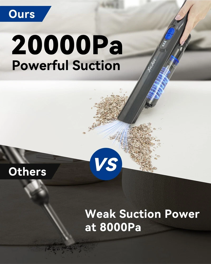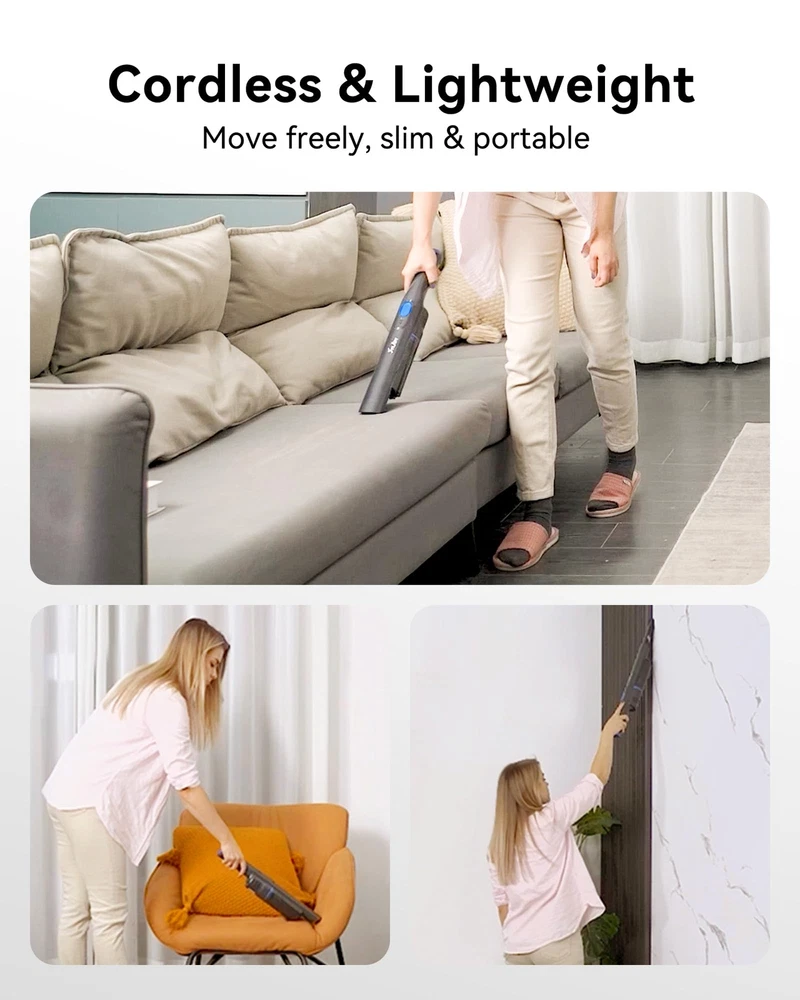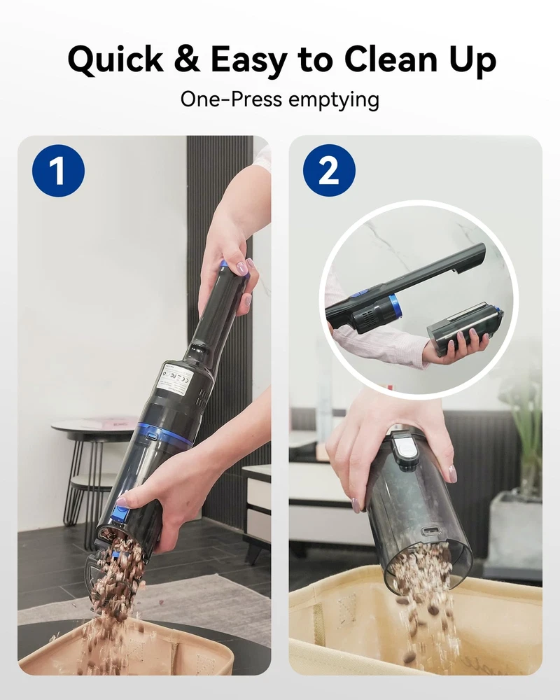 20 KPa Powerful Suction & Portable: With two-speed powerful suction: Max mode with 20 KPa & Standard mode with 12 KPa. This hand vacuum can clean up little messes efficiently and quickly. And lightweight and cordless design makes it easy to hold on to and comfortable to use, suitable for various occasions such as home, car, carpet, drawer, sofa, office Up to 35 Mins Long Lasting & Power Display: This high-power hand held vacuum is equipped with a large capacity battery and fast charging dock. After 4-4.5 hours of full charging, it can work constantly for up to 35 minutes at Standard Mode(Max Mode=15 Mins). The charging base makes the vacuum stay charged and always ready to use. Additionally, the power-indicating light on the control panel could could display the real-time power Dual-Filter System & One-Touch Empty: The car vacuum cleaner is equipped with a filtration system of HEPA filter and stainless steel filter that can filter the dust thoroughly. The dust cup and filters can be easily removed and washable. With just the touch of a button, you can empty the dust cup right into the trash, easy to maintain Multifunctional Accessories & Holder: With sofa brush, 2-in-1 crevice brush, and dust brush, handheld vacuum cordless is great for removing pet hair, crumbs, and dirt spills, also works well for a wide range of surfaces such as beds, carpets, floors, and car corners. Perfectly meet your daily cleaning needs Portable and Lightweight: Designed for ease of use with a 1.5 lbs weight and easy-to-grip handle, the slim and compact design makes it easy for anyone to use for long periods of time
