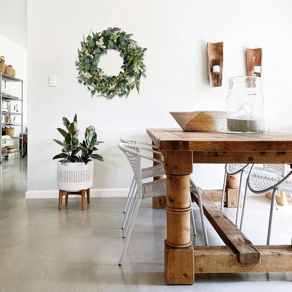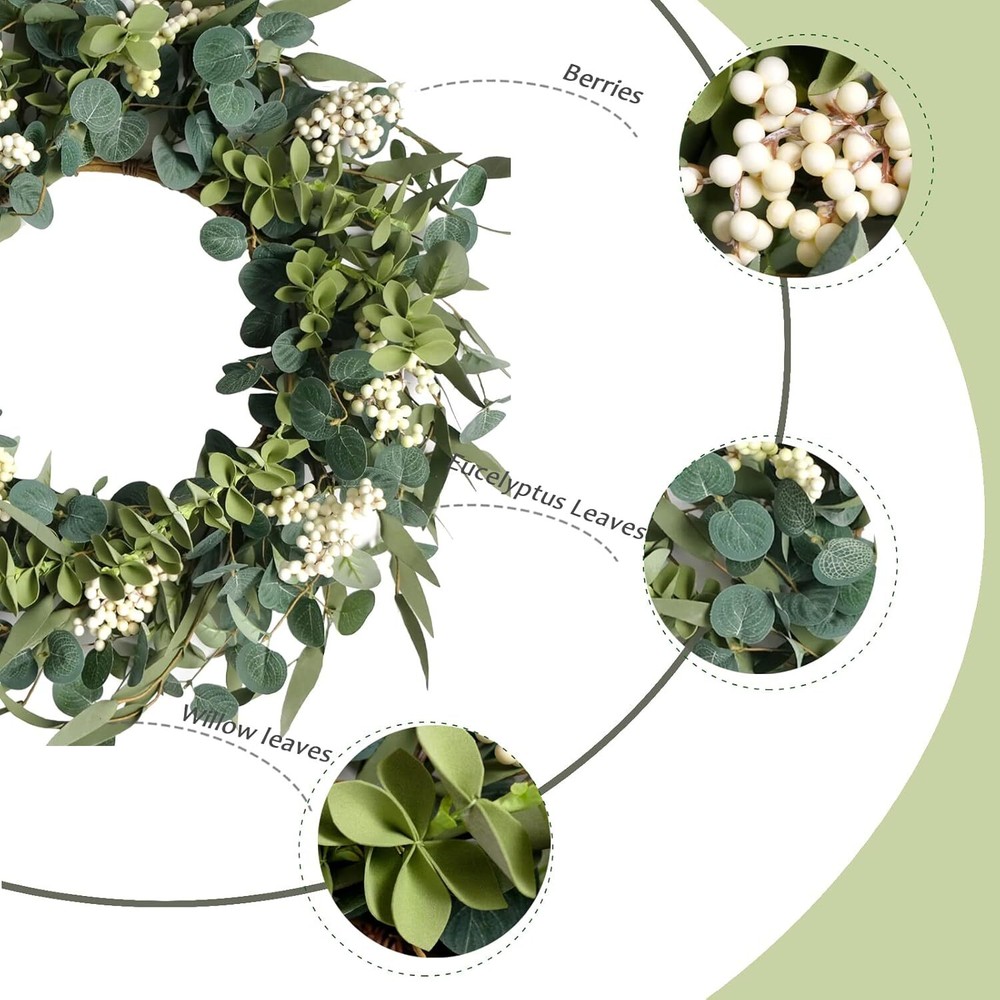 Elevate your space with the **20-Inch Artificial Eucalyptus Wreath** – a timeless, nature-inspired decor piece designed to bring the serene beauty of the outdoors to your home. Perfect for decor enthusiasts who adore natural aesthetics, this handcrafted wreath blends rustic charm with versatile elegance, making it ideal for year-round celebrations, farmhouse styling, or thoughtful gifting. 🍃✨ Features: ✨ All-Season Elegance in 20 Inches With a generous 20-inch diameter, this wreath creates a striking focal point for any space. Its lush blend of artificial eucalyptus leaves, willow sprigs, and tiny white berries mimics nature’s perfection, offering a fresh, vibrant look for spring, summer, holidays, or everyday decor. ✨ Handmade with Premium Craftsmanship Every detail is meticulously crafted by hand, ensuring a realistic, high-quality finish. The durable artificial foliage retains its shape and color, while the reinforced wire frame guarantees longevity – no wilting, watering, or maintenance required! ✨ Versatile Decor for Every Occasion - Front Door Welcome: Impress guests with a lush green greeting. - Indoor & Farmhouse Charm:Adorn walls, windows, mantels, or rustic kitchens. - Outdoor Oasis (Shaded Areas Only): Spruce up porches, patios, or garden gates. ✨ Upgraded Design for Durability & Style The new 2025 version features a sturdy, weather-resistant base (for shaded outdoor use) and an earthy burlap bow for added farmhouse flair. Its lightweight design ensures easy hanging indoors or outdoors with any standard hook. ✨Warm note:Each package contains one wreath. Shipping and packaging may cause the wreath to warp, don't worry, you can take the wreath out and adjust it to your liking. Thank you for your purchase. If you have any questions about your wreath, please feel free to contact us and we will provide you with the best solution. Specifications: Color - Green Material - Foam, Plastic Mounting Type - Door Mount Shape - Round Product Dimensions - 3.5"D x 20"W x 20"H Seasons - Summer, Spring Indoor/Outdoor Usage - Outdoor, Indoor Package List: 1pc