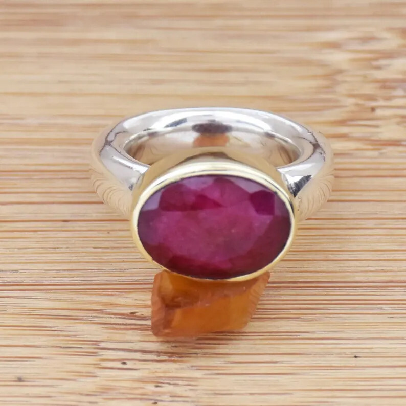 This stunning handmade Indian Ruby ring is a perfect statement piece for those who love unique, bold jewelry. Crafted with care and precision, it features a radiant Indian Ruby set in high-quality 925 sterling silver. The thick band design adds a modern touch, while the two-tone finish gives the ring an eye-catching, bohemian flair. Whether you’re treating yourself or searching for the perfect gift for someone special, this ring is sure to impress. Key Features: Material : 925 Sterling Silver Stone : Indian Ruby (July Birthstone) Design : Handmade, Two-Tone, Bohemian Style, Thick Band Perfect For : Birthdays, Anniversaries, Special Occasions, or Everyday Wear Gift Idea : Ideal for the woman who loves unique, statement jewelry Why You’ll Love It: Elegant & Timeless : The deep red hue of the Indian Ruby adds a touch of elegance and sophistication to any outfit, making this ring perfect for both casual and formal occasions. Durable & Comfortable : Crafted from high-quality 925 sterling silver, the ring is both durable and comfortable for everyday wear. Unique Design : The two-tone finish and bohemian style make this ring stand out from the rest, offering a fresh take on classic jewelry. Meaningful Birthstone : As the birthstone for July, the Ruby is not only a beautiful gem but also symbolizes love, passion, and vitality—making it a thoughtful gift for those born in this month. Sizing Information: Available in various sizes. Please refer to the size chart for the perfect fit. Perfect Gift for Her: Whether for a birthday, anniversary, or just because, this Indian Ruby ring makes an unforgettable gift. Its unique design and stunning appearance will make her feel special and appreciated.