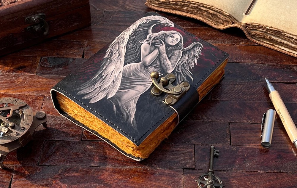The Angel Leather Journal is a luxurious and limited edition handmade leather notebook, perfect for those seeking a unique and high-quality writing journal. With a leather cover and personalized details, this Grimoire journal is crafted in India with attention to detail. Ideal for business, industrial, and personal use, this notebook offers a special touch of luxury and exclusivity for the discerning writer. Angel Leather Journal - Handmade Leather Notebook • Grimoire Journal • Blank Book • Vintage Deckle Edges Paper • Special Gifts For Girls Name : Angel Printed Journal This Journal Is Made From A High Quality Leatherette With A ANGEL Printed Finish And Vintage Looking Paper ★ DIMENSIONS :- The Journal Is Available In 3 Perfect Sizes. 13 inches" x 10 Inches. 10 Inches" x 7 Inches. 8 Inches" x 6 Inches. 7 Inches" x 5 Inches. ★ PAPER :-The Inside Of This Journal Is Handmade Decal Edge Paper That Looks Vintage And Well Stitched Whose Number Is 200 (Please Count Both side) If You Want White Plain Paper So Please Select Right Paper Option There Are Two Options Available. ★ HANDCRAFTED FROM GENUINE LEATHER: Each Journal Is Specially Designed And Handmade From Premium Leather. Artful Hand Stitching To Create A Timeless Space For Your Thoughts. ★ TELL YOUR STORY :- We Designed This Classic Leather Journal As A Time Capsule For Your Thoughts. Capture Your Important Memories, Accomplishments (And Failures), Life-Changing Moments And Evolving Dreams As A Keepsake To Reflect Upon In Years To Come. ★ THE PERFECT GIFT :-Quality You Can Trust: High-Quality Craftsmanship Makes This An Essential Tool For Poetry, Art, Sketching, Writing, Drawing, Calligraphy Leather Journal Give Your Loved Ones A Thoughtful Gift That Will Last For Years To Come! Great For A Birthday, Anniversary, Or Graduation Ignore :- Travel journal Antique journal Handmade leather journal Sun and moon Leather journal celestial embossed Book of shadows Grimoire journal Sun and moon journal Angel journal