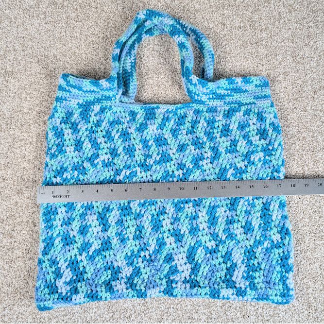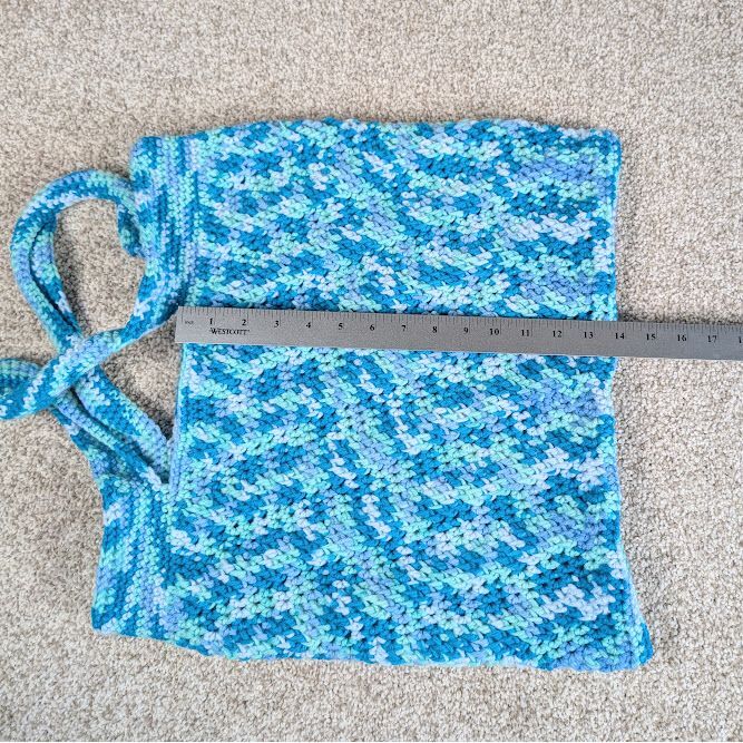 Looking for a way to cut down on plastic bag use? Grab one of my grocery totes and carry more in every bag! My grocery totes are strong and flexible. I can fit 2 gallons of milk in one of my totes and carry it up a flight of stairs - no problem! No more bags breaking because it snags on the edge of a box. No more paper bags falling apart when it gets wet. And the best part? My bags are machine washable and dryer safe. I use these bags every week and it amazes the grocery store clerks how much can fit in 1 bag. The bags are my own design and made from yarn used to standing up to abuse. Each bag is 14" tall (without the handle) and 17" wide. That's a lot of stretch! Hand Crocheted in a Smoke Free/Cat Friendly Home - Cats are not allowed to play with yarn. Keywords: crochet bag, handmade tote, blue tote bag, wave pattern, beach bag, market bag, summer bag, handcrafted, crochet tote, textile bag, boho bag, casual tote