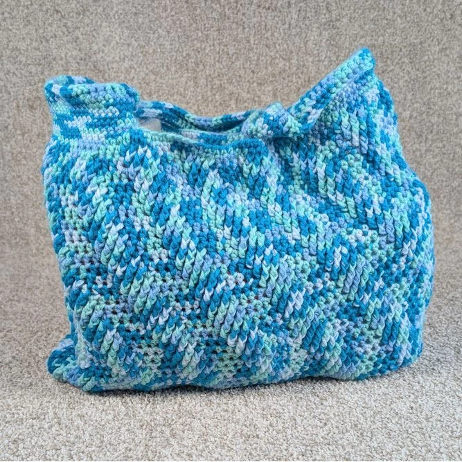 Looking for a way to cut down on plastic bag use? Grab one of my grocery totes and carry more in every bag! My grocery totes are strong and flexible. I can fit 2 gallons of milk in one of my totes and carry it up a flight of stairs - no problem! No more bags breaking because it snags on the edge of a box. No more paper bags falling apart when it gets wet. And the best part? My bags are machine washable and dryer safe. I use these bags every week and it amazes the grocery store clerks how much can fit in 1 bag. The bags are my own design and made from yarn used to standing up to abuse. Each bag is 14" tall (without the handle) and 17" wide. That's a lot of stretch! Hand Crocheted in a Smoke Free/Cat Friendly Home - Cats are not allowed to play with yarn. Keywords: crochet bag, handmade tote, blue tote bag, wave pattern, beach bag, market bag, summer bag, handcrafted, crochet tote, textile bag, boho bag, casual tote
