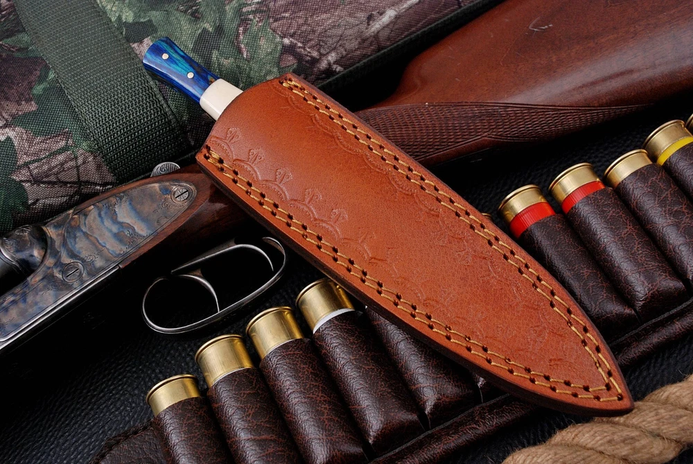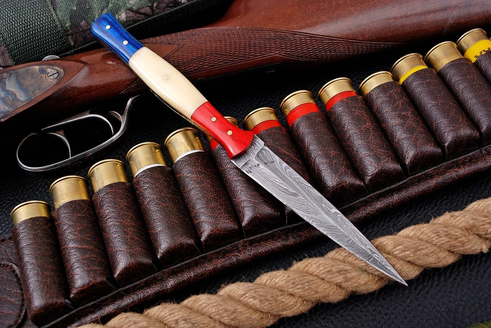 Introducing a stunning handmade dagger, made from high-quality Damascus steel, with a full tang for added durability. The double-edged blade is perfect for hunting, combat, throwing, survival, and as a boot knife. The black and silver-colored blade is 4 inches long, with a plain edge, and is paired with a wooden handle for a comfortable grip. Overall length:8.5” inch Blade 4” inch Handle 4.5” inch With Genuine leather sheath This dagger is a beautiful addition to any collection and is perfect for those who appreciate expert craftsmanship and attention to detail. With its ambidextrous design, it is suitable for both right and left-handed users. Made in the United States, this original piece also features a colored blade, adding to its unique appeal. Knife & Sheath
