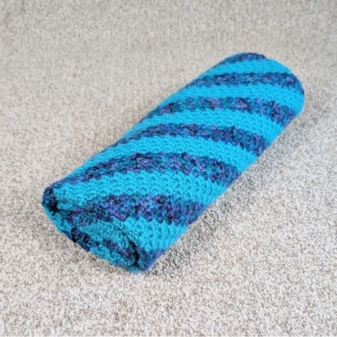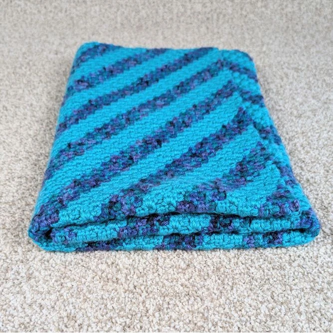 Striped Baby Blanket - Blue/Turquoise Snuggle up your baby with this beautiful handmade blanket. Perfect for the stroller or car seat, or lay on the ground for some much needed tummy time. The bright colors are great for brain development and the soft yarn feels great against baby's delicate skin. This blanket measures 36" x 36". Made with love in a Smoke Free/Cat Friendly Home. Cats are not allowed to play with yarn Keywords: knit throw, striped blanket, turquoise throw, navy blue blanket, diagonal stripe throw, handmade blanket, knitted throw blanket, square throw, textured blanket, home decor, cozy throw, baby blanket, baby throw, stroller blanket, crib blanket, tummy time blanket
