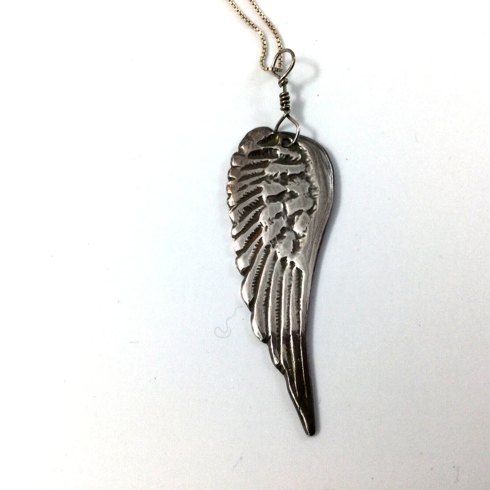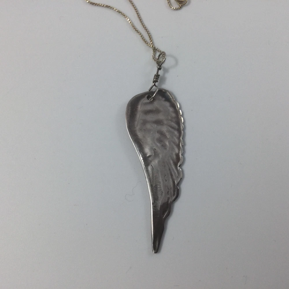 Handmade Fine Silver Wing Pendant Sterling Silver 18" Box Chain Necklace. Handmade by artist. One of a Kind. Pendant is made of fine silver clay, 99.9 % silver. Pendant is 3" large. No mark on the pendant. InvN/G/18/3 FS