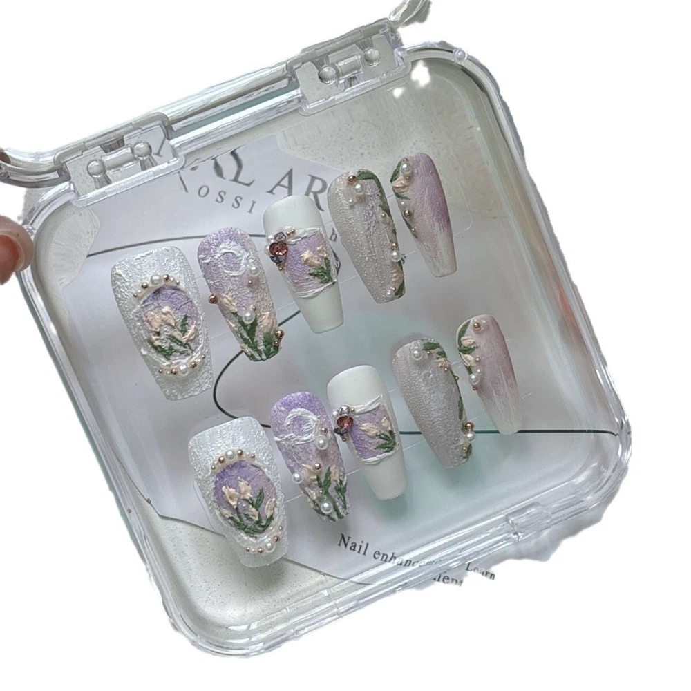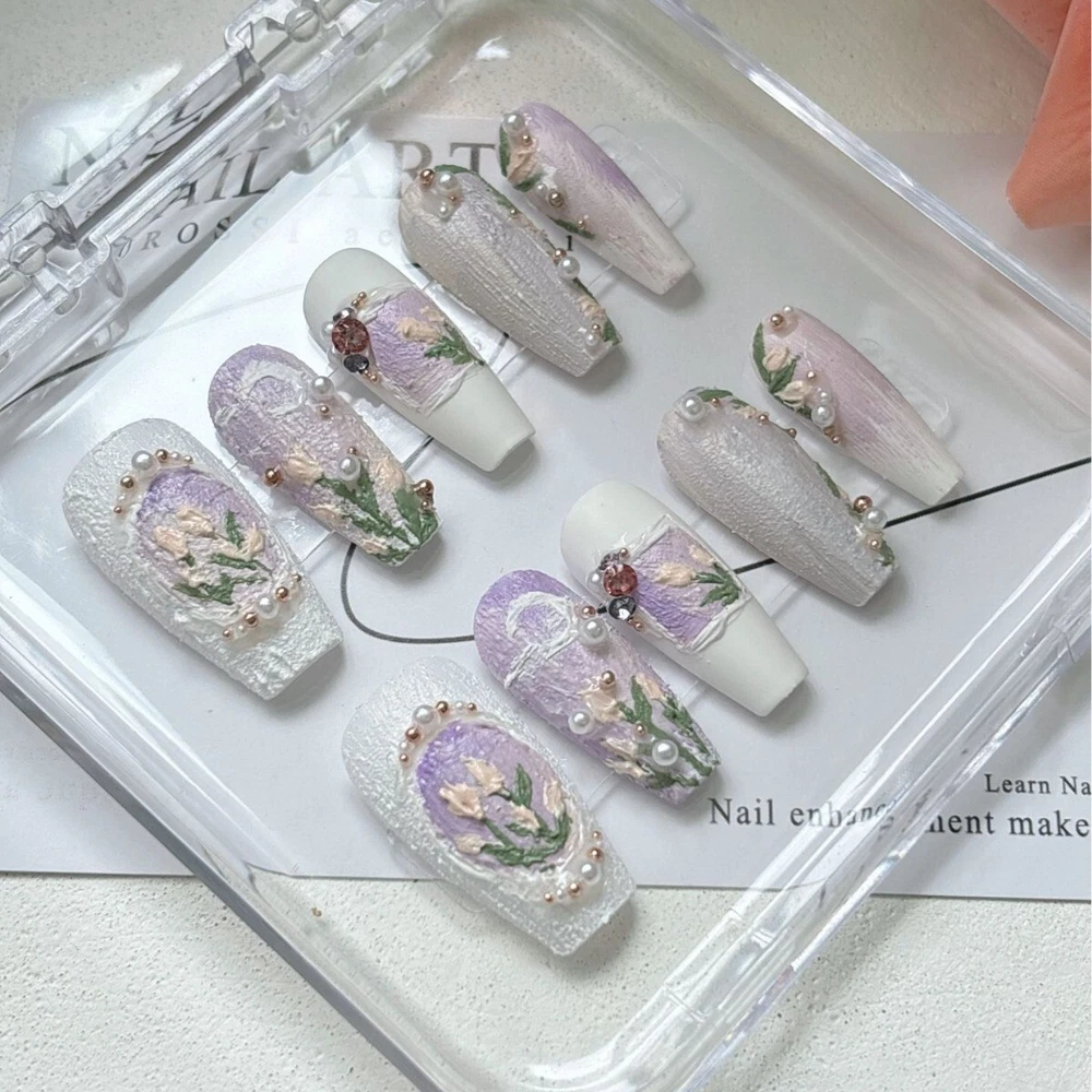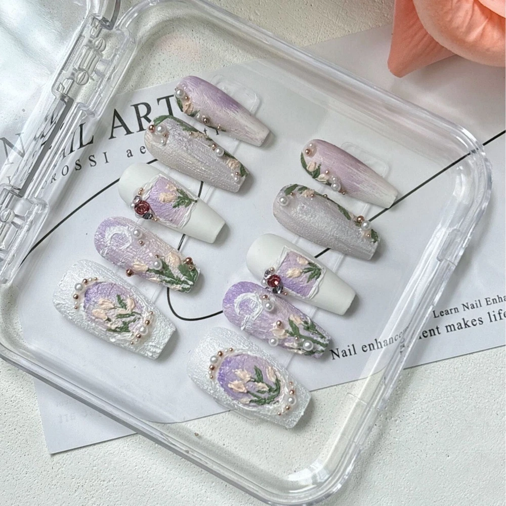 Handmade Flowers 3D Painting False Nail Long Coffin Press on Nail for Nail Art