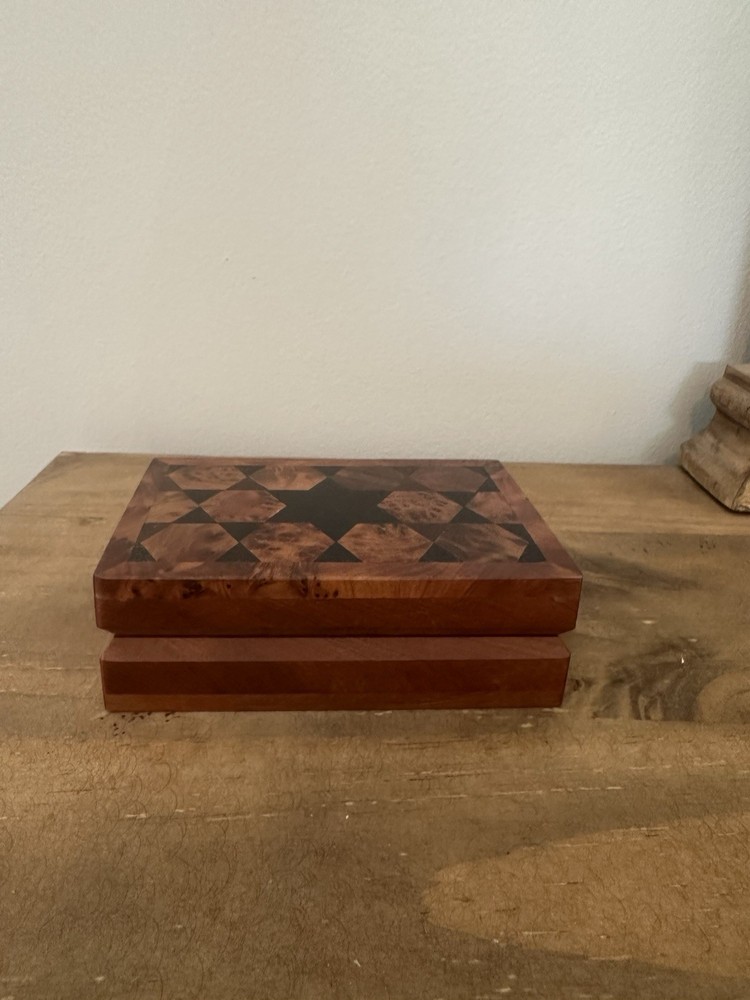 This beautiful trinket box is perfect for storing your small items in style. Made from high-quality wood, it features intricate carvings and a hinged lid. The box is handmade in Morocco and measures 5 inches in length and 1.5 inches in height, making it compact and perfect for any room, whether it's your bedroom, closet, shop, or workshop. The box's pattern is wood grain, and it comes in a beautiful brown color that will complement any decor. It's perfect for all occasions and features a collection of keepsake boxes. The box is also ideal for storing your collectibles, jars, and tins. Get this handmade trinket box today and add a touch of elegance to your space. Discoloring on bottom of box