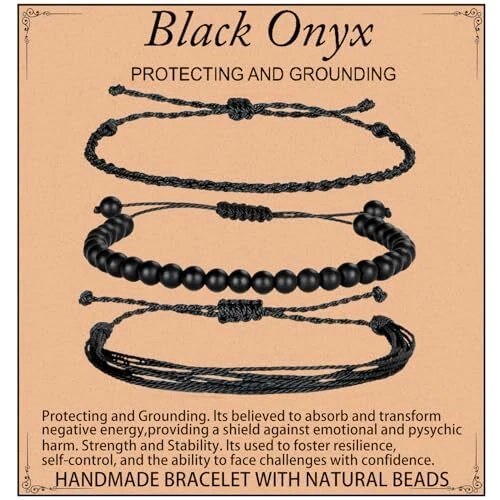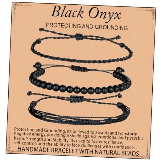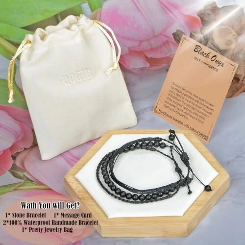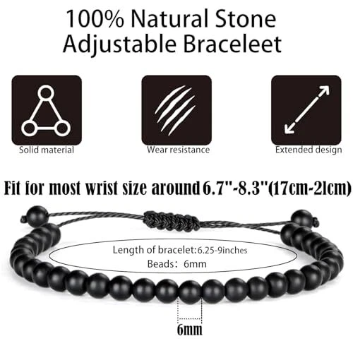 Return Policy Fast Delivery Trusted seller Handmade Healing Bracelets, 6mm Natural Matte Black Onyx Gem Stone Beads Bracelet for Men Women Gifts with 2PCS Size Adjustable Rope Bracelets Product Description Material: Since ancient times, Black Onyx has been considered a gemstone with divine powers and is listed as one of the Seven Treasures of Buddhism, The color black is a symbol of the wisdom. Black Onyx bracelets brings positive energy, protection in creases courage, strength, confidence releases stress and stabilize emotions. Handcrafted Bracelet: The bracelet is made of 100% waterproof wax coated cord and 6mm round loose beads. The string won't fade or disintegrate when exposed to water, so you can swim, surf, skateboard or even take a bath while wearing your lovely bracelet. Size Adjustable Bracelets: The adjustable onyx stone bracelet and Rope Bracelets ensures a perfect fit for 6.25-9 inches wrist size. A Great Gift: It comes in a gift pouch, with a greeting card and 3 pcs bracelet. This uniquely designed unisex bracelet set is an ideal gift for your friends, loved ones or yourself on special occasions such as parties, anniversaries, graduations, and birthdays.. Guarantee: All stones are unique, so colours and patterns may vary from those shown in the pictures, we hope you will be pleased with the uniqueness of your stone bracelet. Shipping Returns Payment Shipping Shipping is FREE to all addresses other than APO/PO boxes in the lower 48 states. All our stock ships from US-based warehouses. Shipped via USPS or UPS (depending on location and package weight) Unless stated otherwise, all orders will ship within 24-72 hours of your payment being processed. Check our feedback to see the great reviews of FAST shipping we offer. Returns Seller does not accept returns Payment We currently accept payment via eBay managed payments only. Once payment is cleared, we will dispatch your shipment within 1-3 business days. Please refer to the "Shipping" tab for more information regarding shipping speed to your destination.