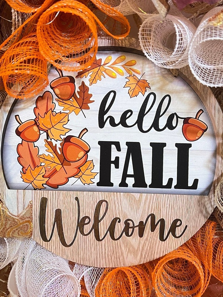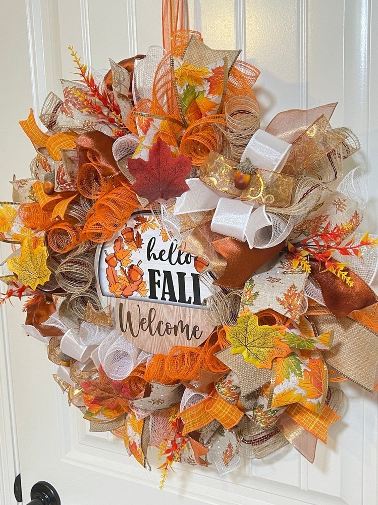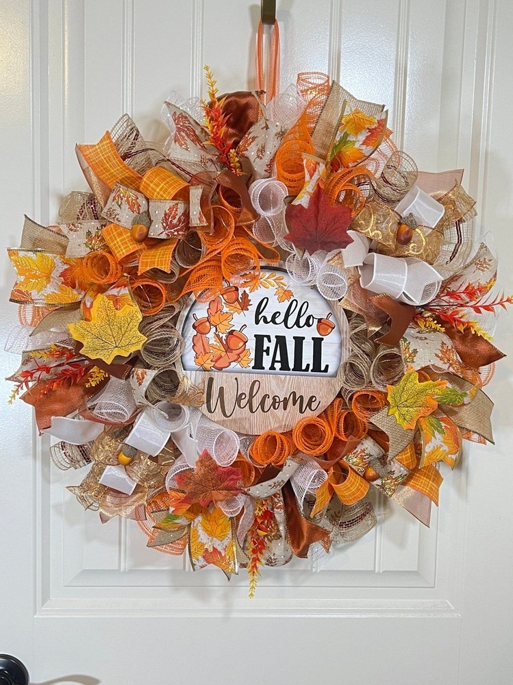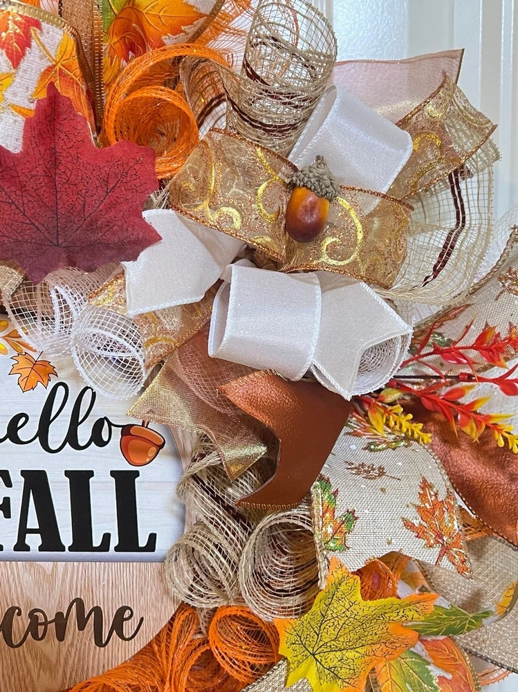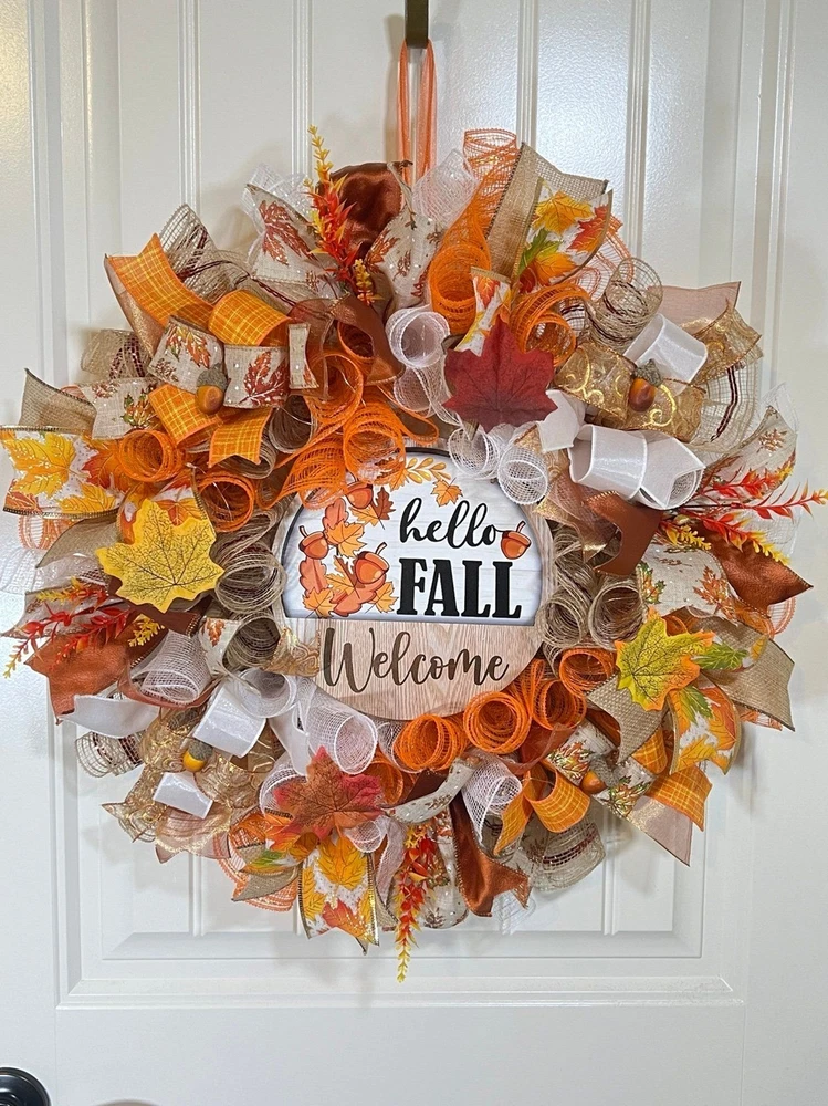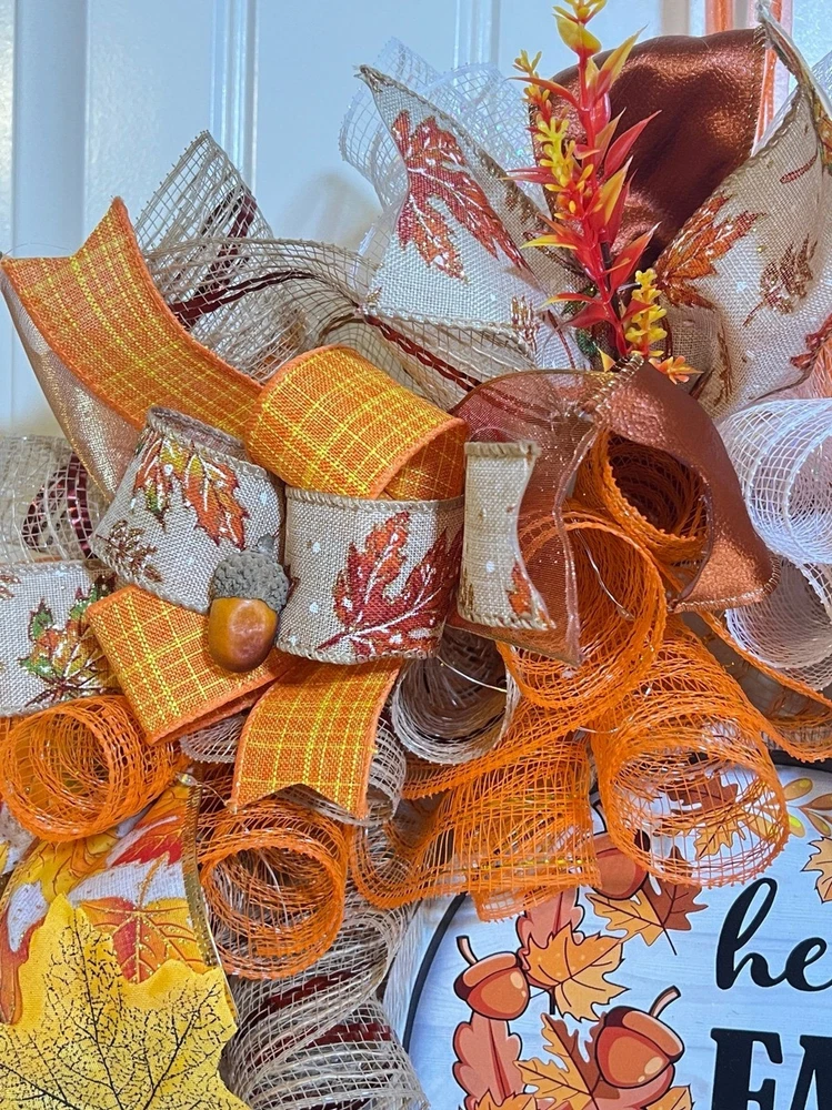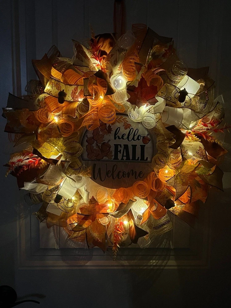 About 22 inches, 5 inch-deep. Burlap w/ fall colored tinsel, orange, and white mesh back door or mantle wreath. Fall themed w/ vibrant multi color wired ribbons (9 styles). A “Hello Fall Welcome” Wooden Acorn & Leaves Sign + faux leaves, acorns and spray adorn this festive wreath. This wreath is built on a 14 frame. Perfect for decorating your home for Fall/ Autumn/Thanksgiving. Fitted with 20 LED lights to illuminate at night. Wreath made in a smoke free environment. Wreath can be displayed either indoors or outside. However, for optimal durability please avoid direct sunlight and harsh elements. Ships in a sturdy box that will be closer to frame size in order to stay below the shipping dimension restrictions. On arrival you may need to fluff ribbons and bows so it will be ready to beautify your door or mantle. Please be aware, deco mesh has a tendency to fray at the edges. Simply trim any loose strands to preserve the beauty of the wreath. W12Tg13D212179COP