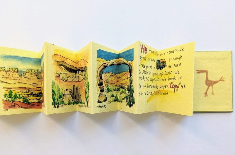 THE SOUTHWEST, by Donna Thomas. A Miniature Book, Published by Peter and Donna Thomas, Santa Cruz, 2010. Handmade Book on handmade paper, #47 of only 50 copies. Hardcovers, 1 3/4 by 2 1/4 inches, 16 accordion pages. A series of watercolor paintings of landscapes that Donna Thomas painted in National Parks during a trip taken through the Southwest by Peter and Donna Thomas during their "wandering book artist's gypsy wagon trip through Arizona and Utah in the Spring of 2010, and reproduced by her on these pages." Fine condition.