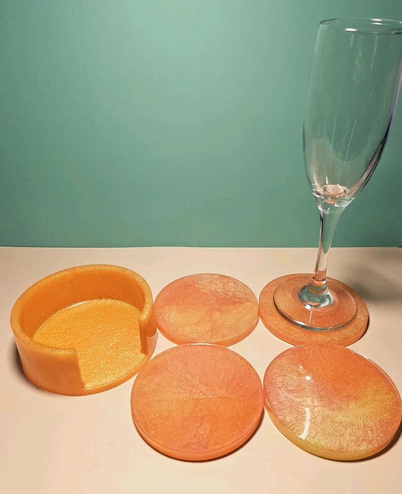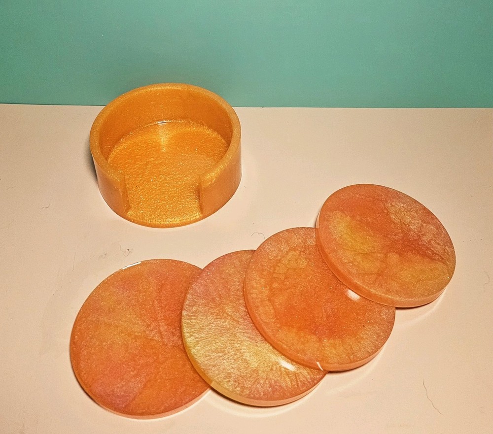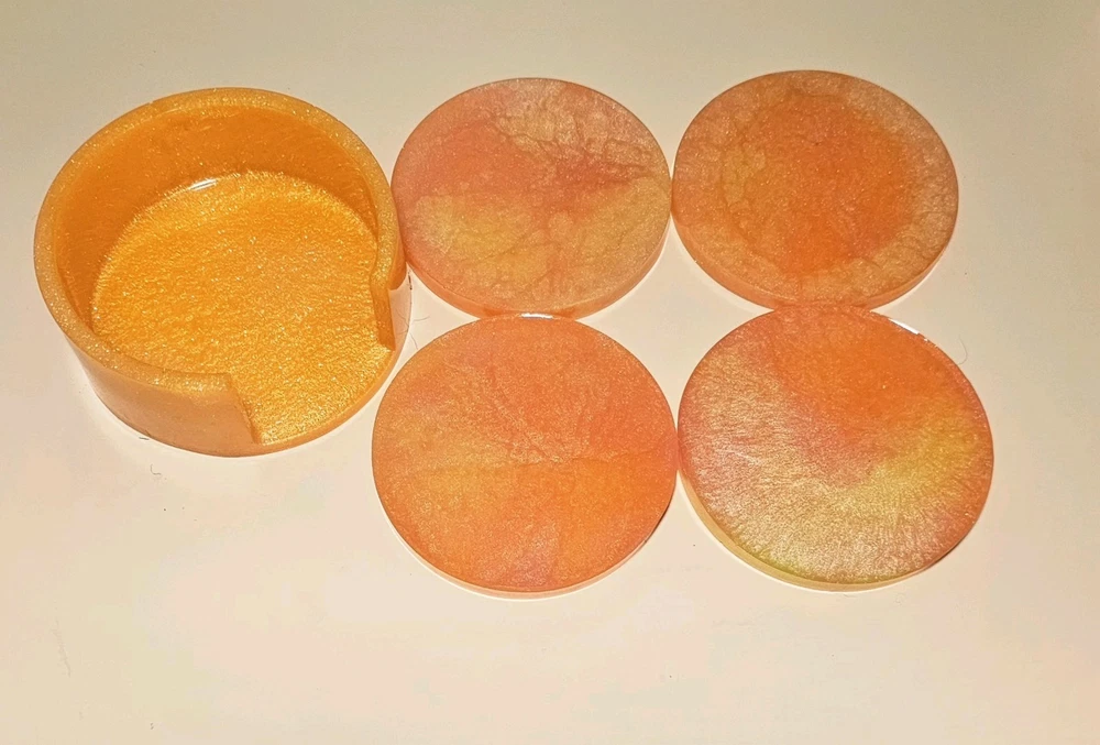 This handmade 5-piece coaster set features a marbled design in orange and yellow, perfect for all occasions. Made with durable Expy Resin material, these round coasters have a modern style and are lightweight, stackable, and should be hand washed only. With a diameter of 4 inches, these coasters are a stylish and practical addition to any kitchen, dining table, or bar area. Made in the United States, this coaster set is both personalized and unique, adding a touch of creativity to your decor.
