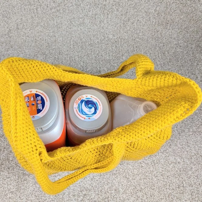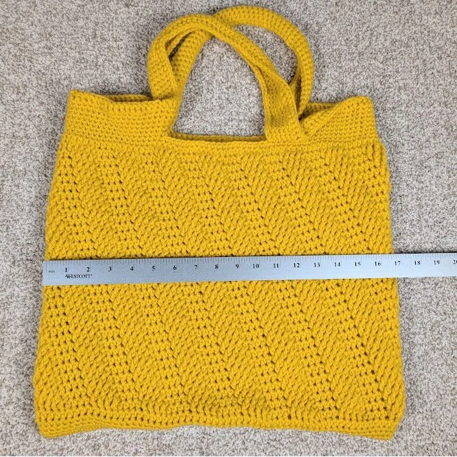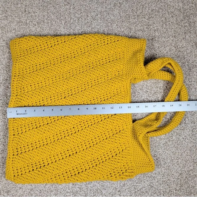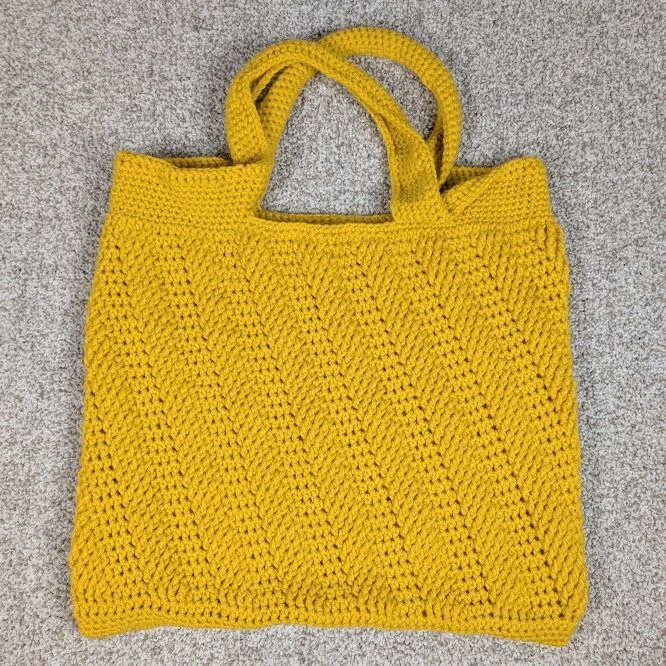 Looking for a way to cut down on plastic bag use? Grab one of my grocery totes and carry more in every bag! My grocery totes are strong and flexible. I can fit 2 gallons of milk in one of my totes and carry it up a flight of stairs - no problem! No more bags breaking because it snags on the edge of a box. No more paper bags falling apart when it gets wet. And the best part? My bags are machine washable and dryer safe. I use these bags every week and it amazes the grocery store clerks how much can fit in 1 bag. The bags are my own design and made from yarn used to standing up to abuse. Hand Crocheted in a Smoke Free/Cat Friendly Home - Cats are not allowed to play with yarn. Keywords: knit tote bag, mustard yellow bag, chevron pattern, handmade bag, cotton tote, knitted handbag, yellow tote, summer bag, beach tote, shopping bag, handcrafted bag, textile bag