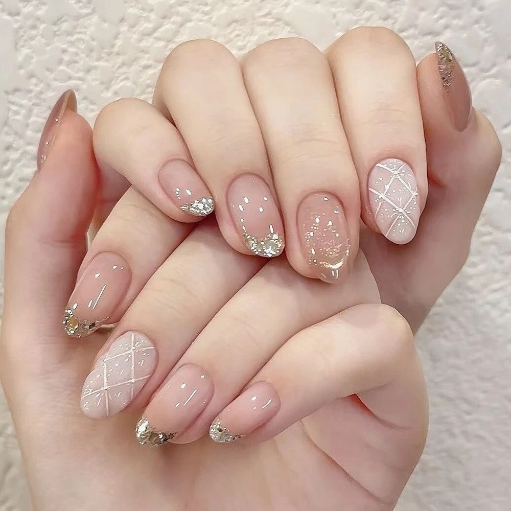 Handmade Rhinestones French Pink False Nail Short Almond Press on Nail Nail Art