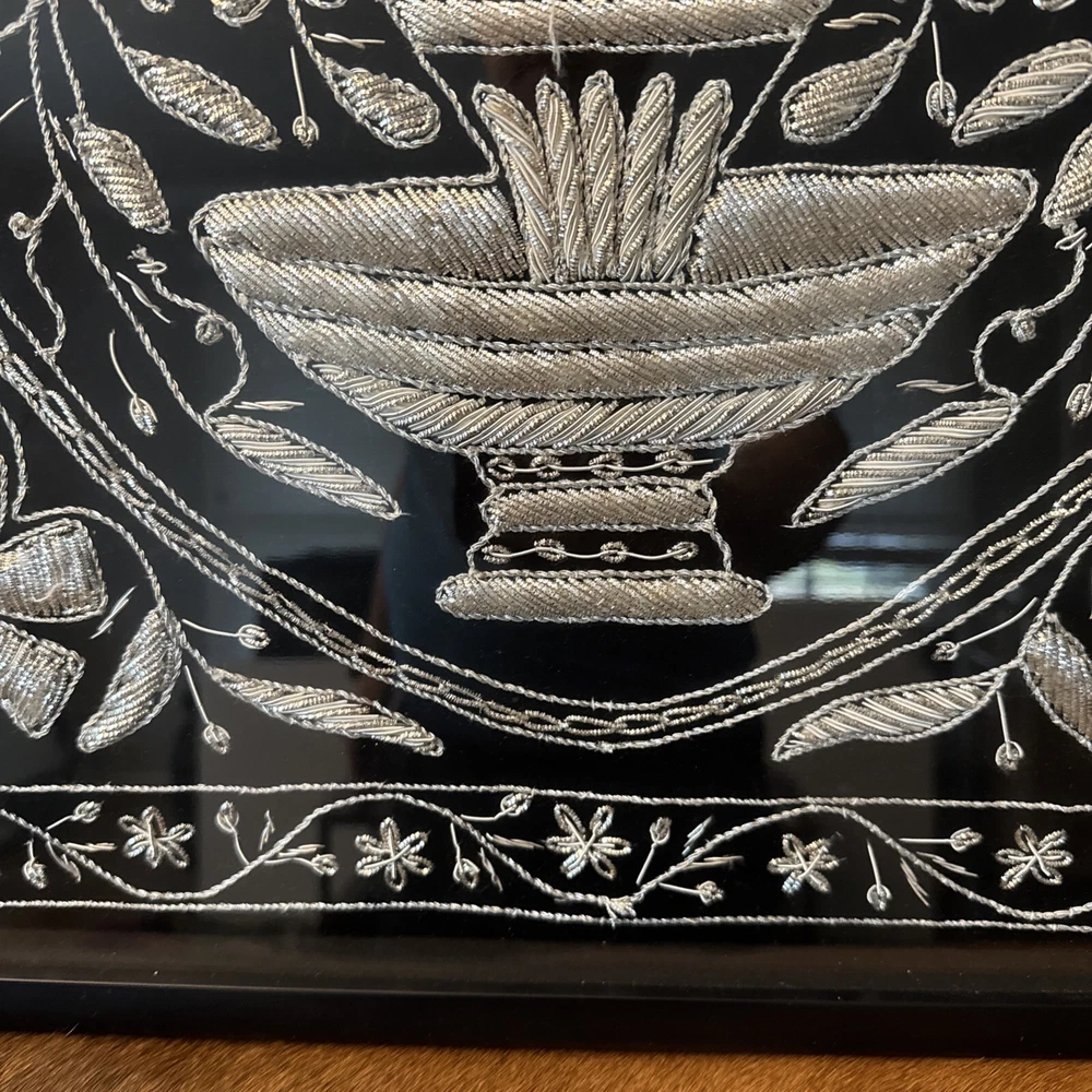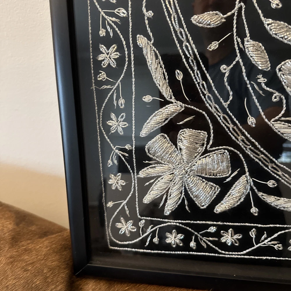 This exotic handmade tapestry originates from Oman and features a stunning design of a silver fountain with a flower vase, crafted with a blend of cashmere and silver thread in a Persian style. Sealed frame for protection and for preservation. Measuring 21 inches in width and 31 inches in height, this vintage piece showcases a beautiful floral pattern with a 3D effect, perfect for decorating various rooms in your home. Fairtrade certified and featuring intricate braided details, this decorative tapestry adds a touch of artistry and elegance to any space.