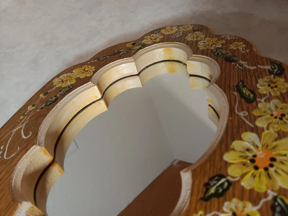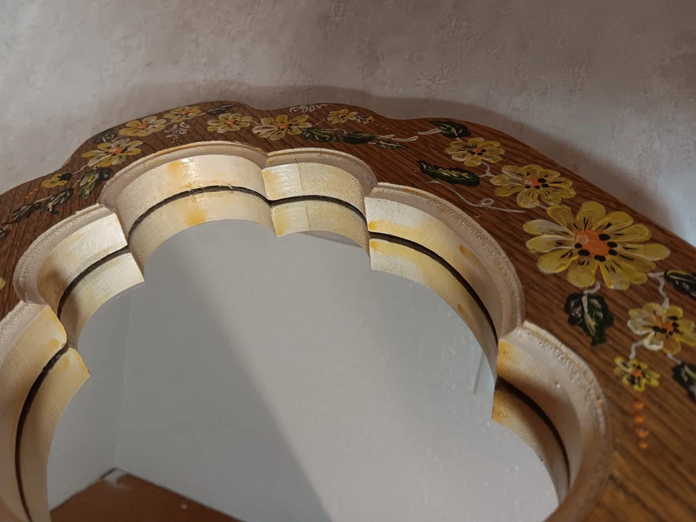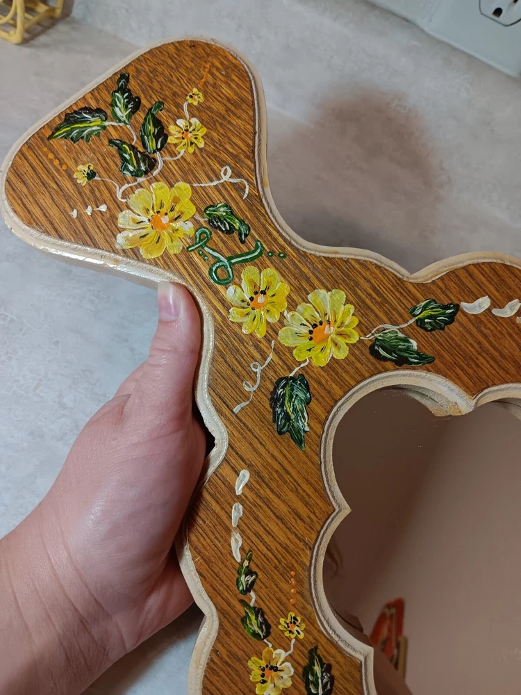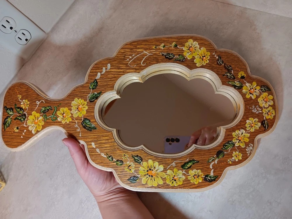 Very Retro Handmirror style inspired Wall Mirror. Handmade with gorgeous 1970s vibes! Beautiful yellow daisies painted onto a stunning wood stained background. Has a sawtooth bracket in the back for hanging. Please review photos fully and ask for additionals if needed! Approx Dimensions: Height: 17 inches Width: 9.5 inches * Please keep in mind that these are secondhand items and may show signs of wear, use, and patina. But, this just adds to the beauty of the pieces! Colors may vary from the website and what you see in person. We do our best to make the colors in the pitcture as true as possible. Thank you for understanding!