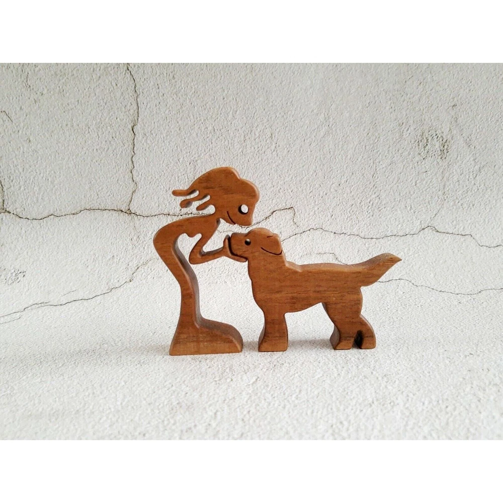 Handmade Wooden Figurine Girl and Labrador Walnut Wood Unique Home Decor Look at this couple! I'm sure they bring their owners happiness and pure love! Great present for Labrador, Retriever and just dogs lovers, friends, mom and dad... It's just great present! The figure is made of walnut wood, processed with special orange oil and wax. Ideally smooth surface, without hooking. High - 5" (12 cm) Width - 3.5" (9 cm) This figurine will be the only one, because we never use the same kind of tree sample. And for sure nature never will make the same pieces like snowflakes. We only looking for perfect peace of wood for THAT ONE!