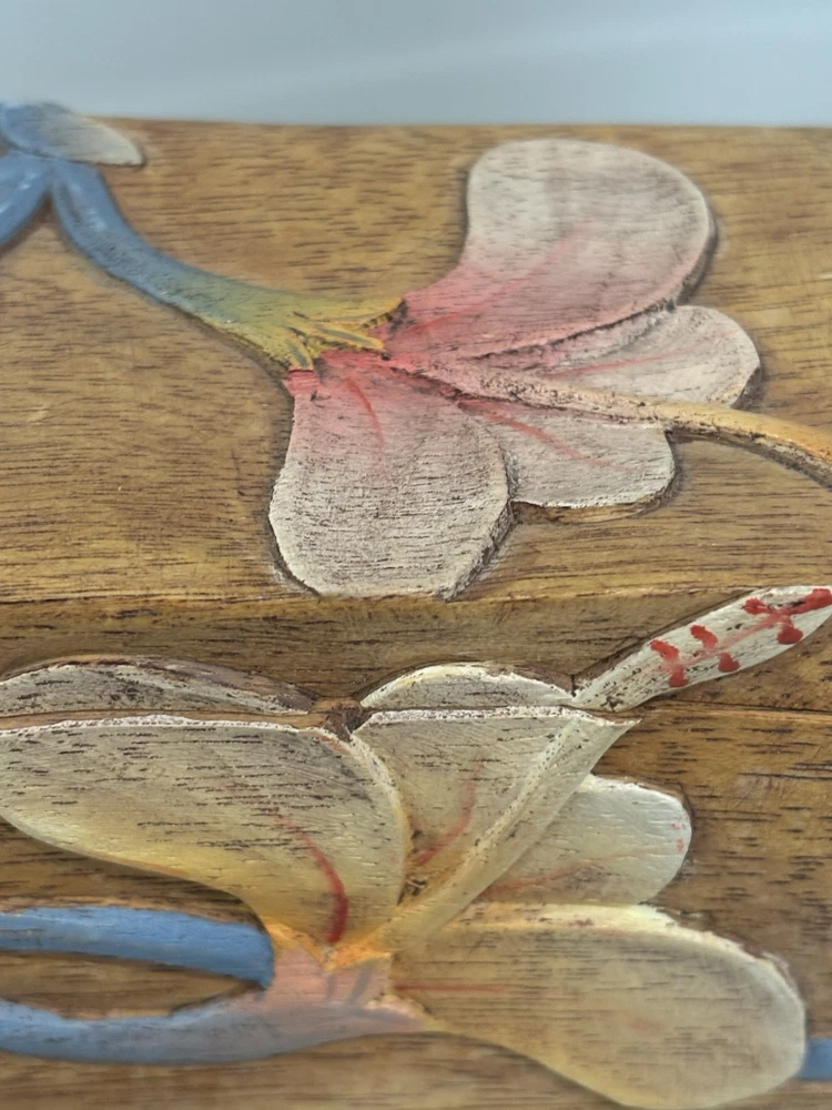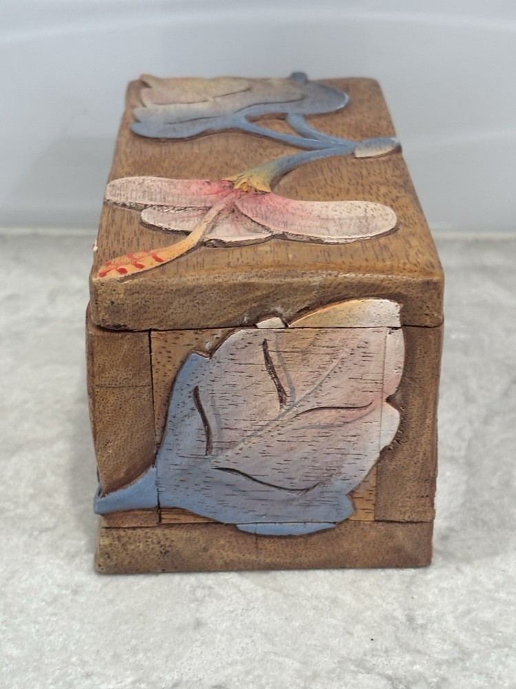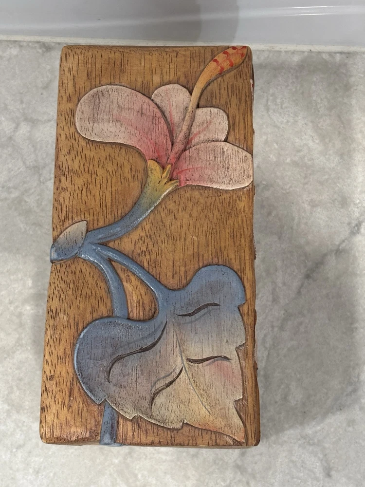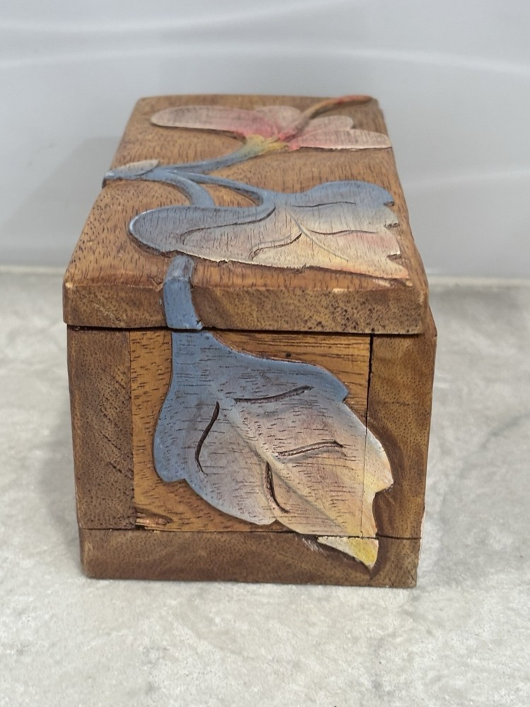 Handmade trinket box with hand carved painted leaves on five sides. It has a hinged lid. The box measures approximately 6” by 3” by 3”. It is preowned and in good condition.