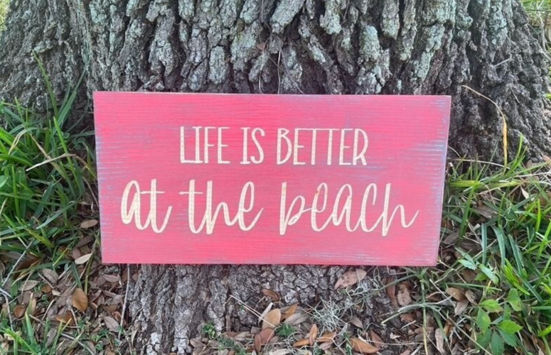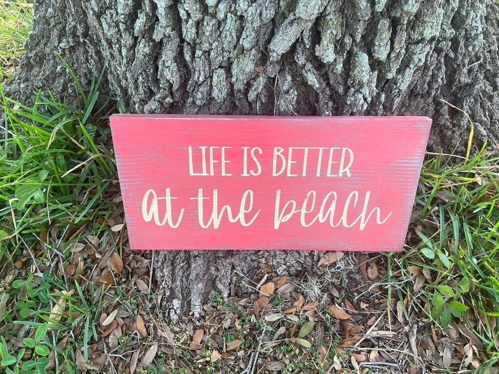 “Life is better at the beach” wood decor sign. Handmade wall decor with a CNC machine. Distressed blue and pink paint. Engraved lettering for a 3D look. Sign is 18 inches wide and 9 inches tall. 2 Keyhole hooks are located on the backside for hanging. Multiple top coats for added protection.