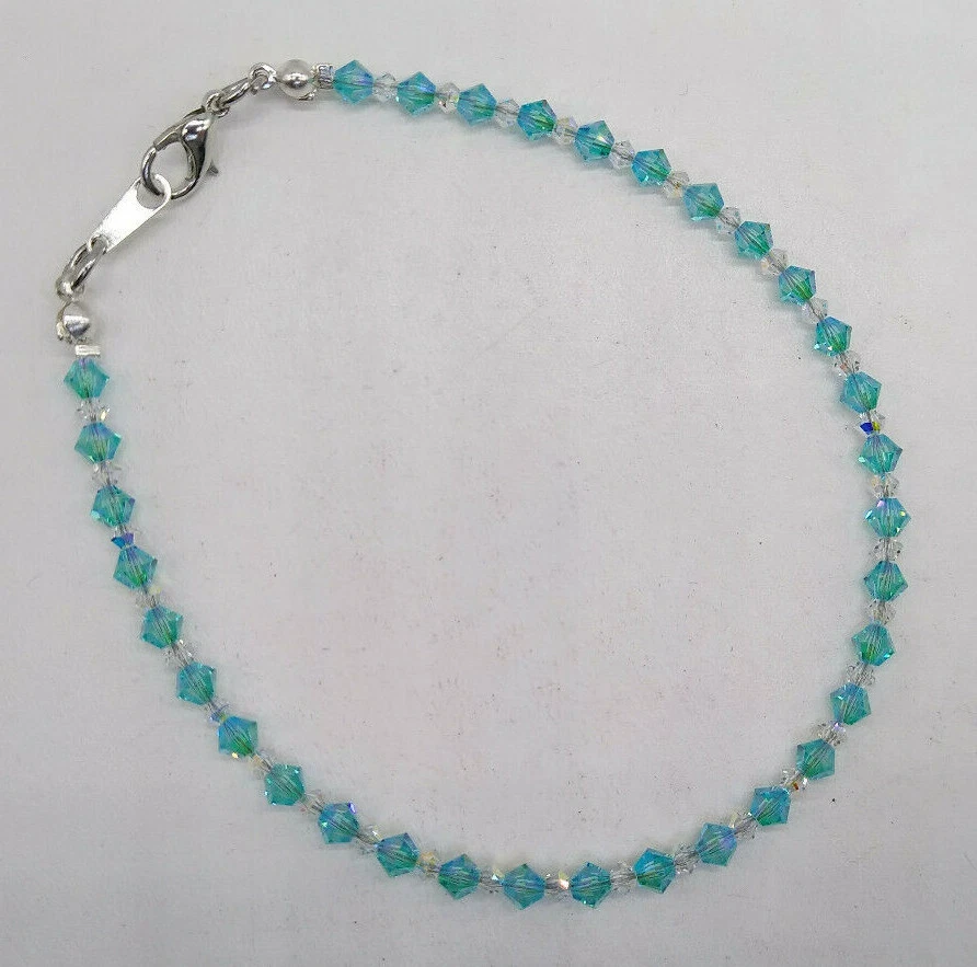 This handmade, durable anklet/ bracelet consists of 4mm Swarovski Crystal Light Turquoise Shimmer 2X and clear bicone beads strung on stainless steel wire. The lobster claw clasp is made up of steel, pewter, and silver-plated pieces. **The "shimmer" effect is a new effect that is comparable to the classic Aurora Borealis AB effect. The shimmer effect is a lighter coating that is more transparent than AB so the original bead color shines through and radiates three shades of its color for even more "shimmering" light reflections Guideline for choosing length *Small Bracelet - 6" (child size) *Medium Bracelet - 7" *Large Bracelet - 8" (also a great anklet size for school age kids) Small Anklet - 9" Medium Anklet - 10" Large Anklet - 11" (I've had school age girls use this size to be a choker necklace) **Let me know if you are an in between size (ex 7 1/2") I will make it to your size :-) I love doing custom orders, so feel free to request your own combination of colors. I have over 100 different colors of Swarovski bicones. If at any time the anklet breaks for any reason or needs a sizing adjustment, send it back to me at any time and I will fix/alter it. All you pay is shipping. I take very much pride in making my jewelry sturdy and durable. **Combined Shipping w/ multiple items: $3.95 (USA Orders) ~~Shipping should automatically combine when adding items to your cart; if you get charged extra for shipping, please send me a message and I will refund you. ~~Canada - $18 Flat Rate Shipping ~~International Orders: I ship through the Ebay Global Shipping program **Special Requests ~~ Feel free to make special requests with your order; I'll do my best to accommodate. **Returns ~~I take pride in sending quality and durable items. If there is any problem/concern/question with your order, please contact me. I will do what I can to correct, compensate, or replace the item. **NOTE: USPS is experiencing delays, so even though I send the package out on time, actual delivery may be later than expected. This is out of my control and in the hands of the post office. My daughter is learning the importance working hard and saving her money. She is selling her handmade bracelets. Please consider adding one to your cart with your order. Thank you! Handmade Elastic Bracelets by Cassie; Age 7 | eBay