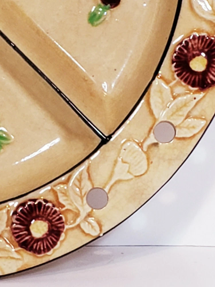 Handpainted Japan Slotted Relish Dish 4 Slots 9". There are 4 spots looks like maybe a Handle went across. Nice 4 slotted dish for condiments relish black olives pickles and so on . Has a couple of flea bits that can be touched up no cracks.