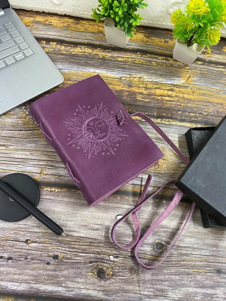 This product is a luxurious and limited edition leather spellbook handstitched with a purple and ocean blue cover. It features a brass C clasp lock for secure closure. Handmade in India, this A4 and A5 size book can be personalized to make it a unique and special item for any business or industrial use. With its high-quality materials and craftsmanship, this spellbook is a rare find for those seeking a premium and personalized writing instrument. Elevate your journaling experience with the exquisite "Sun and Moon Embossed Purple and Ocean Blue Leather Journal" from TajHandicraftGifts. This artisanal masterpiece effortlessly marries celestial charm with unparalleled craftsmanship, inviting you to embark on a journey of self-expression and creativity. Meticulously handcrafted, this journal stands as a testament to the dedication and artistry that TajHandicraftGifts pours into every creation. Measuring a convenient 7x5 inches, this journal's dimensions are perfectly tailored to accompany you on adventures, both inner and outer. The leather cover, adorned with intricate sun and moon embossing, radiates a timeless energy—symbolic of harmony and balance between opposing forces. The sun represents vitality and illumination, while the moon embodies introspection and mystery. Together, they set the tone for your journaling exploration. Distinguished by its unique versatility, this unique journal features not only one but four choices of color pages: serene blue, classic white, vintage elegance, and delicate pink. Each page offers a distinct backdrop to your thoughts, sketches, and musings. With every turn, you'll find a canvas that resonates with your mood and inspiration. Adding to its allure, a brass C clasp lock adorns the journal's cover. This lock not only secures your innermost thoughts but also symbolizes the treasured writers journal secrets and intentions that lie within. Like a guardian of your aspirations, it embodies the essence of timeless mysteries. For gifting, the Sun and Moon Embossed Leather Journal is a thoughtful choice that transcends occasions. Whether for your loved ones or friends, this journal embodies the spirit of connection and creativity. Handmade by TajHandicraftGifts, blank journal it exudes authenticity and passion, making it a keepsake to be cherished for years to come. Indulge in the duality of the cosmos and the magic it inspires. With the Sun and Moon Embossed Leather Journal, you're not just holding a journal—you're holding a universe of possibilities, waiting to be explored, expressed, and celebrated.