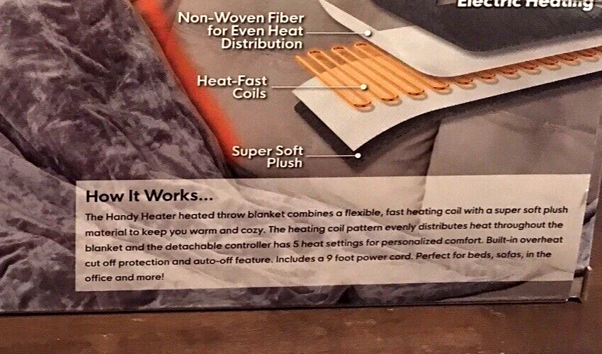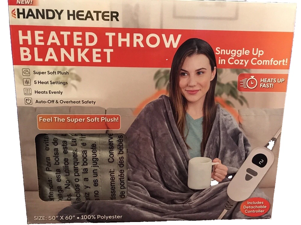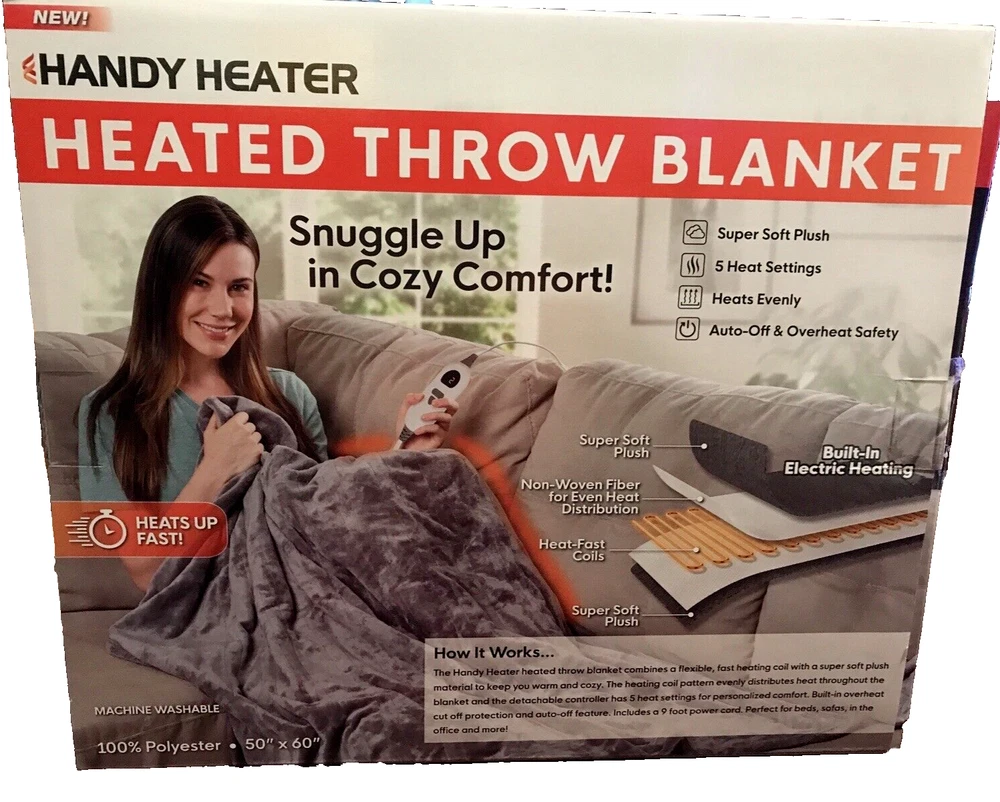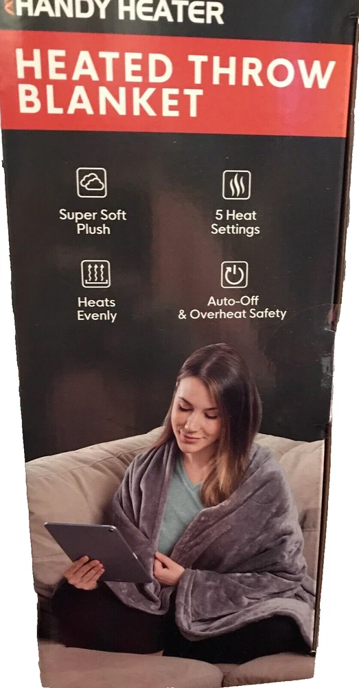 Handy Heater™ Heated Throw Description Wrap Yourself In Luxurious Warmth! Handy Heater™ Heated Throw Blanket is made of soft sherpa polyester and ensures even heating throughout. Heated blanket features easy-to-use digital control with 5 heat settings and built-in auto shutoff. It's perfect for keeping cozy on the couch, in an armchair or resting in bed. Polyester. Machine wash. 50"L x 60"W. Features Soft sherpa polyester 50" long x 60" wide overall Features 5 heat settings and ensures even heating throughout Easy-to-use digital control and built-in auto shutoff provide convenience and safety Machine wash CONSTRUCTION & CARE Polyester Machine wash The Box shown will be shipped inside of another box so that it will not have shipping labels on the original box.. So you can give this as a gift. ANY QUESTIONS PLEASE ASK This item is new. We had a brick and mortar store that we closed and we are listing everything on eBay. If you are looking for anything please ask. If we have we will list it and notify you first. Please CLICK ON the link below to go to MY EBAY STORE: https://www.ebay.com/str/Longaberger-Vera-Bradley-Coach-ETC To see many more items. We have lots of items not yet listed. So if you are looking for something and can’t find it then send an email and we will let you know if we have it and then we will get it listed. You can scroll down the left side of the page to find the items that you want to look at. We have: Dinnerware ~~ Longaberger, Pfaltzgraff, and Corelle. Purses and Travel items in Vera Bradley, Longaberger, and Coach Baking items -- Longaberger, Pfaltzgraff, and Pyrex Clothing items and Shoes Lots of Collectibles and Christmas items -- Dept 56, Fenton, Thomas Kinkade, Peter Max, Andrew Warden, Boyds Bears, Ty Beanie Babies & more We have Dinnerware ~~ Longaberger, Pfaltzgraff, and Corelle. TERMS: FOR BUY IT NOW: Immediate Payment FOR AUCTIONS: Payment must be received within 24 hours after auction close. If no payment is received, We will request refund from eBay for our fees; eBay will record a strike against you; The item will be re-auctioned. SHIPPING: WE ONLY SHIP TO CONFIRMED ADDRESSES. PLEASE INCLUDE YOUR PHONE NUMBER. I USE ONLINE FEDEX OR UPS SHIPPING FOR HEAVY ITEMS AND A PHONE NUMBER IS REQUIRED. Items marked as free ship with FedEx or UPS can only be shipped in the continental United States. Contact us if you want this shipped to Alaska, Hawaii or a Post Office Box REFUNDS: If you return items then they must be returned in the same condition that it was shipped. For instance. If the leather purses had protective covering then it must be returned in the same condition. If an item had a box then the original box must be returned without damage. If the item is not returned in the same condition then we have the option of deducting fees up to 50%