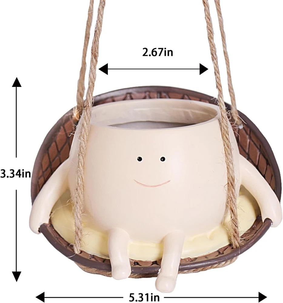 Hanging Swing Chair Planter Pot Smile Face Plant for Indoor Small, Dy-s Product Details Material: Resin Color: Dy-s Special Feature: Window Treatments, With Hanging Rope and Hooks, Fade Resistant Style: Art Deco Planter Form: Plant Pot Shape: Round Indoor/Outdoor Usage: Outdoor, Indoor Mounting Type: Hanging Plant or Animal Product Type: Succulent Product Dimensions: 3"D x 3"W x 3"H Brand: NINIPAPA Number of Pieces: 1 Pattern: Solid Included Components: Hook Theme: Plant Finish Type: Polished Number of Levels: 1 Size: Small Item Weight: 10.5 ounces Manufacturer: NINIPAPA Swing Face Planter Specifications: Swing face planter contain 1 S-shaped hook, 1 length string and 1 swing chair flowerpot. Hanging Swing Face Planter : Swing face planter suit for small succulent. This is a cute swing flowerpot, as the same as before original swing flowerpot. The small size hanging face pot still can grow more plants you like. Swing Planter & Smile Friends : When you plant your favorite plants in our hanging head flowerpot, the head flowerpot will look like a smile friends. It will eliminate worries in your life or work. You can also get the friends you want by dressing up the flowerpot according to your own style Funny Plant Pots: This cute plant pots suitable for various plants, as succulents, snake plants, philodendron, string of pearls, chain of hearts, spider plant, imitation flowers and so on. It was a very good flower head pot for indoor and outdoor use Unique Gift: Swing face planter flower pot seems like little child, it can decor livingroom, bedroom or garden. This is the unique great gift idea on anniversary, birthday, Christmas, Easter, New Year, wedding, housewarming gift for your wife, mom, dad, kids, friends, grandparents, brother, sister, colleagues who is plant lovers