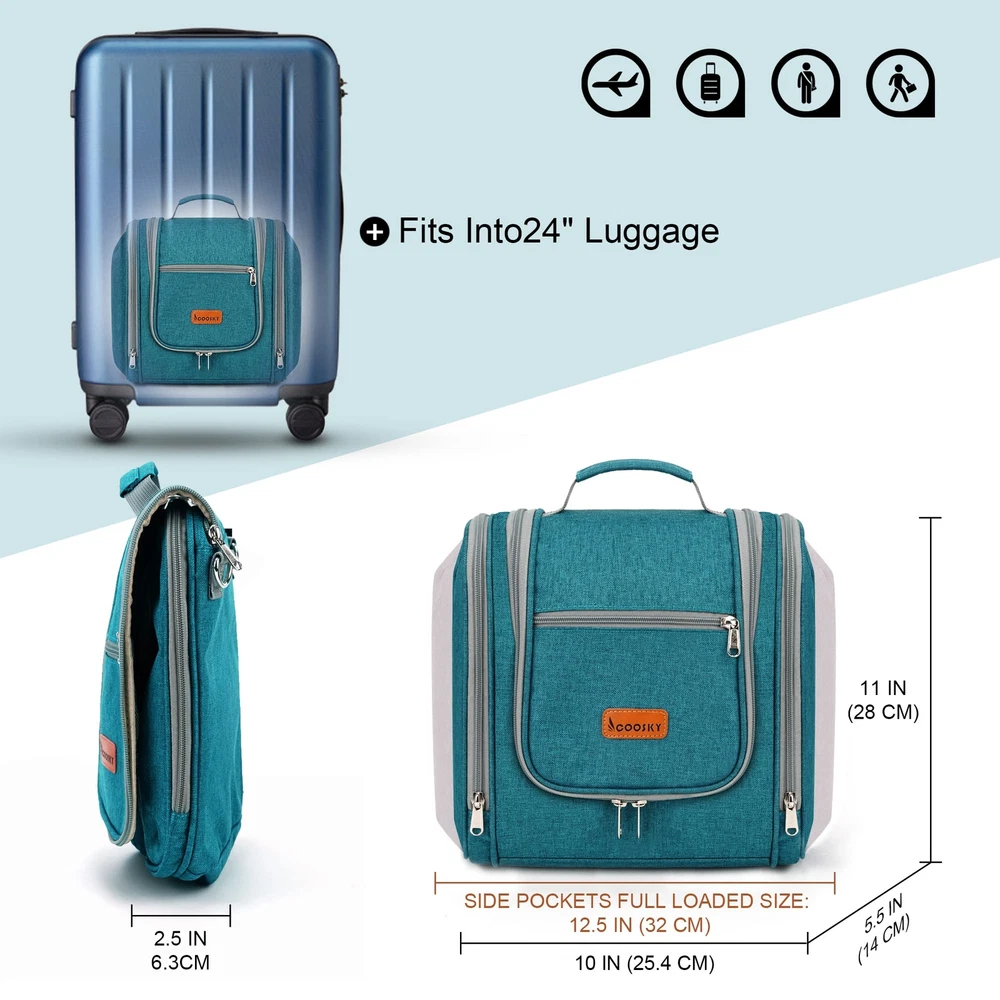 COOSKY Hanging Travel Toiletry Bag for Women and Men, 6 Organizer Compartments, Extra Large Toiletries Bag, Bathroom Cosmetic Bag, Water-resistant Makeup Bag, Holds Full-Size Shampoo, Blue GREAT ORGANIZER MASTER – This toiletry bag is designed with 6 storage compartments. You can categorize all your toiletries and put them into different pockets to make your journey orderly. Full load state size:12.5" L x 5.5" W x 11" H, Empty state size:10" L x 5.5" W x 11" H. its main compartment can accommodate full-size toiletries and cosmetics (23.6 oz / 700 ml), travel essentials. ONSIDERABLE DESIGN - The elastic band and elastic mesh bag in the main compartment and two side compartments can keep the bottle fixed and upright. It has two waterproof compartments specially used for storing wet items. You can put your wet towel, toothbrush, shaving kit, and leaky cosmetics in it. The 360 degrees rotate metal hook gives you a variety of hanging options. EASY TO USE - When it is open and hanging, all the pockets will be lined up and displayed in front of you. You can quickly take out the items you need without making a mess inside. It has shoulder straps. You can carry it on your shoulder, carry it by hand, or put it in a trolley box to free your hands. CRAFTSMANSHIP DETAILS - All stressed positions have been reinforced. SBS zipper ensures smooth opening and closing without cracking. Metal hardware can bear more weight. The elastic mesh bag can hold more items. MULTIPLE USAGE - In addition to traveling, you can take it to the gym and on a business trip. You can also hang at home and install some infrequent items to save your washstand space and make everything less crowded. In addition, it is also suitable for Christmas, Halloween, and birthday gifts to your family and friends. SHIPPING Domestic Buyers - We have confidence in our products, but if you are not fully satisfied please contact us within 30 days of purchase and you will get full refund. - We ship within 3 business days of payment, usually sooner - We offer FREE shipping on all orders! - We only ship to the lower 48 states, no APO/FPO addresses or PO Boxes allowed International buyers – please note: Import duties, taxes, and charges aren't included in the item price or postage cost. These charges are the buyer's responsibility. - Please check with your country's customs office to determine what these additional costs will be prior to bidding or buying. * Order Cancellation Policy ** You can return a product for up to 30 days from the date you purchased it. 1. The seller reserves the right to cancel the special case only due to eBay cancellation fee. 2. The decision of seller is the final. 3. The seller will respond to the cancellation request within 2 business days. Please wait for the result of cancellation. 4. In case the cancellation is not completed by some reasons, the buyer can follow the options below to get the refund. 4.1 The buyer can reject the item when it arrives. 4.2 The buyer can send the item back to the seller within 30 days If the buyer receives item (USA Shipment ONLY). The seller will provide the FREE return label to the buyer when the buyer opens " Return Item" case on eBay by using the reason as "Change my mind" ONLY. 5. When buyer has placed the order. The order will be processed and completed by automatic warehouse system within 5 minutes. In case that buyer sends the cancellation request after 5 minutes of placing the order, the request will be rejected. **Sending direct message to cancel the order is not allowed for every case.* Return Policy For the return case - If buyer would like to return the items for refund or replacement, please CONTACT SELLER to receive the free return label from seller. The refund or replacement will be processed with the tracking number of return label which is provided by seller only. The other ways of return which are not approved by seller will not be processed for the refund or replacement.