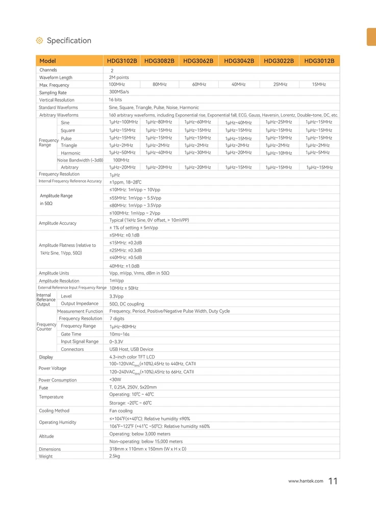 Hantek Arbitrary Function Waveform Generator Pulse Harmonic Frequency Meter HDG3022B 1μHz- 25Mhz Frequency Range Introduction: HDG3000B sets arbitrary waveform generator, pulse generator, function generator, harmonic generator, frequency meter 5 functions in one. It uses the DDS (Direct Digital Synthesizer) technology, and can generate stable, pure, and low-distortion output signal. Humanized interface design and keyboard layout give users extraordinary experience. Rich configuration interfaces can easily achieve computer control of the instrument, which provides users with more solutions for measurement. Features: Frequency range: 1μHz ~ 100MHz/80MHz/60MHz/40MHz/25MHz/15MHz. Up to 300MSa/s sampling rate, no distortion of analog waveforms. 16-bit vertical resolution ensures the accuracy of waveform amplitude. Equip with dual channels with equal performance, equivalent to two independent signal sources. The storage depth of up to 2M ensures the creation of more waveform cycles and better waveform details. A 4.3-inch color TFT LCD screen, a clear and intuitive user interface. Rich modulation function, support for AM, DSB - AM, FM, PM, ASK, FSK and PSK, BPSK, QPSK, 3 FSK, 4 FSK, OSK and PWM, etc. 1μHz frequency resolution: When the impedance is high, the amplitude range is 2mV~20Vpp. When the impedance is 50Ω, the amplitude range is 1mV~10Vpp. Built-in 80MHz high-resolution frequency meter. Standard communication interface: front USB 2.0 high speed (USB Host) and rear USB 2.0 full speed (USB Device). More than 160 kinds of arbitrary signals, such as exponential rise, exponential decline, ECG signal, Gaussian, semi-positive vector, Lorentz, dual-tone multi-frequency, DC voltage, etc. Built-in 16 harmonic generator function, output with specified frequency, amplitude and phase of harmonics, usually used in harmonic detection equipment or harmonic filter equipment test. Function: 1. Equip with the sine wave with the maximum output bandwidth of 100MHz. Frequency range: 1 μ Hz~100MHz; Adjustable offset: ± 5V; Adjustable phase: 0 ° ~ 360 ° . 2. Equip with the square wave with the maximum output bandwidth of 15MHz. Frequency range: 1 μ Hz~15MHz; Adjustable offset: ± 5V; Adjustable phase: 0 ° ~ 360 ° . 3. Equip with the triangle wave with the maximum output bandwidth of 2MHz. Frequency range: 1 μ Hz~2MHz; Adjustable offset: ± 5V; Adjustable phase: 0 ° ~ 360 ° ; Adjustable symmetry: 0%~100%. 4. Equip with more than 160 kinds of arbitrary waveform output. Index rise, index fall, ECG signal, Gauss, half vector, Lorentz, dual tone multi-frequency, DC voltage and other more than 160 kinds of arbitrary signals. 5. Equip with dual channel output modulation waveform AM/FM. Rich modulation functions, support for AM, DSB - AM, FM, PM, ASK, FSK and PSK, BPSK, QPSK, 3 FSK, 4 FSK, OSK and PWM, etc. 6. Equip with dual channel output burst function. Support control of burst output by internal, manual or external trigger sources. Three burst types are supported, including multi cycle, infinite cycle, and gated. 7. Equip with an 80MHz frequency meter. The instrument can measure the frequency, period, duty cycle, positive pulse width and negative pulse width and other parameters of the external input signal. Specifications: Model HDG3102B HDG3082B HDG3062B HDG3042B HDG3022B HDG3012B Channel 2 Wavelength 2M Frequency range 100MHz 80MHz 60MHz 40MHz 25MHz 15MHz Sampling rate 300MSa/s Voltage resolution 16Bits Waveform Standard waveform output sine wave, square wave, triangular wave, pulse wave, noise, harmonics Arbitrary waveform output 160 kinds of arbitrary waveforms, including exponential rise, exponential fall, ECG signal, Gauss, half vector, Lorentz, dual tone μ lti-frequency, DC voltage, etc Frequency property Sine wave 1 μ Hz ~ 100 MHZ 1 μ Hz ~ 80 MHZ 1 μ Hz ~ 60 MHZ 1 μ Hz ~ 40 MHZ 1 μ Hz ~ 25 MHZ 1 μHz ~ 15 MHZ Square wave 1 μ Hz ~ 15MHZ 1 μ Hz ~ 15 MHZ 1 μ Hz ~ 15 MHZ 1 μ Hz ~ 15 MHZ 1 μ Hz ~ 15 MHZ 1 μHz ~ 15 MHZ Pulse wave 1 μ Hz ~ 15 MHZ 1 μ Hz ~ 15 MHZ 1 μ Hz ~ 15 MHZ 1 μ Hz ~ 15 MHZ 1 μ Hz ~ 15 MHZ 1 μHz ~ 15 MHZ Triangle wave 1 μ Hz ~ 2 MHZ 1 μ Hz ~ 2 MHZ 1 μ Hz ~ 2 MHZ 1 μ Hz ~ 2 MHZ 1 μ Hz ~ 2 MHZ 1 μHz ~ 2 MHZ Harmonic 1 μ Hz ~ 50 MHZ 1 μ Hz ~ 40 MHZ 1 μ Hz ~ 30 MHZ 1 μ Hz ~ 20 MHZ 1 μ H z ~ 10 MHZ 1 μHz ~ 5 MHZ Noise (3 db) 100 MHZ bandwidth Arbitrary wave 1 μ Hz ~ 20 MHZ 1 μ Hz ~ 20 MHZ 1 μ Hz ~ 20 MHZ 1 μ Hz ~ 15 MHZ 1 μ Hz ~ 15 MH Z 1 μHz ~ 15 MHZ Resolution 1 μ Hz Precision ± 1ppm, 18~28 ℃ Triangular wave property Linear ≤ 1% of peak output (typical, 1kHz, 1Vpp, symmetry 100%) Symmetry 0% ~ 100% Arbitrary wave property Wavelength 2M Vertical resolution 16 Bits Sampling rate 1 μ Sa/s~62.5 MSa /s, 1 μ Sa/s resolution Time of rise/fall Ns of 9 or higher Overshoot Typical (1Vpp) ≤ 5% Harmonic property Harmonic frequency ≤ 16 Harmonic type Even harmonics, odd harmonics, all harmonics Harmonic amplitude All harmonic amplitude can be set. Harmonic phase All harmonic amplitude can be set. Amplitude property (50 Ω terminal) Shipping policy 1. We will send out your order within 3 working days, the tracking number will be updated to you once your order has been shipped. Standard shipping will take 8-12 business days for delivery and expedited shipping takes 2-7 business days. If there is any delay, it may be caused by bad weather or custom inspection which is not in our control, but don't worry, we will keep to follow your order until you receive it. 2. We try our best to make you get desired products as soon as possible. In case you receive wrong products, please contact us timely for exchange or refund. If damaged, please refuse to sign and send us the message ASAP. 3. Shipping cost does not include DHL/FedEx /UPS Remote area service charge , buyer will afford if your address belongs to it ,it is USD45 for it . Warranty&Return Policy: 1.-We encourage all customers to communicate with us through eBay messages. If you have any questions or c