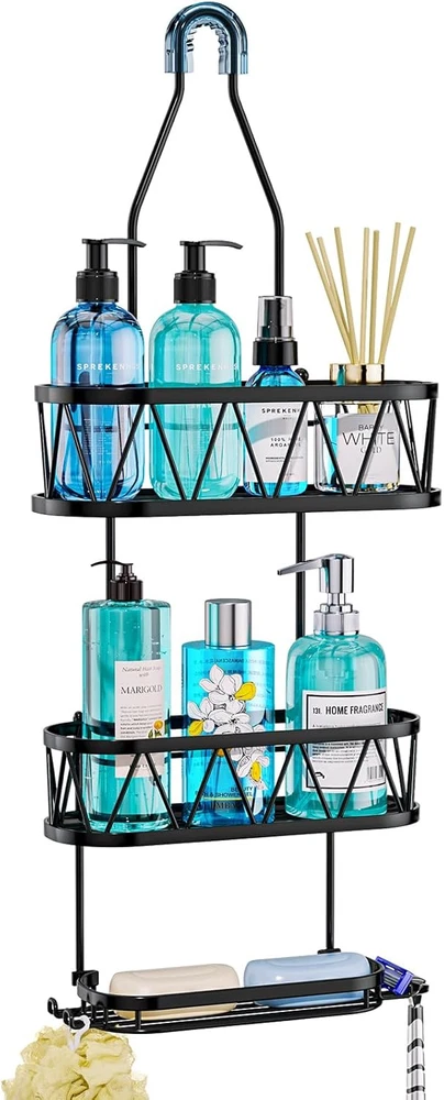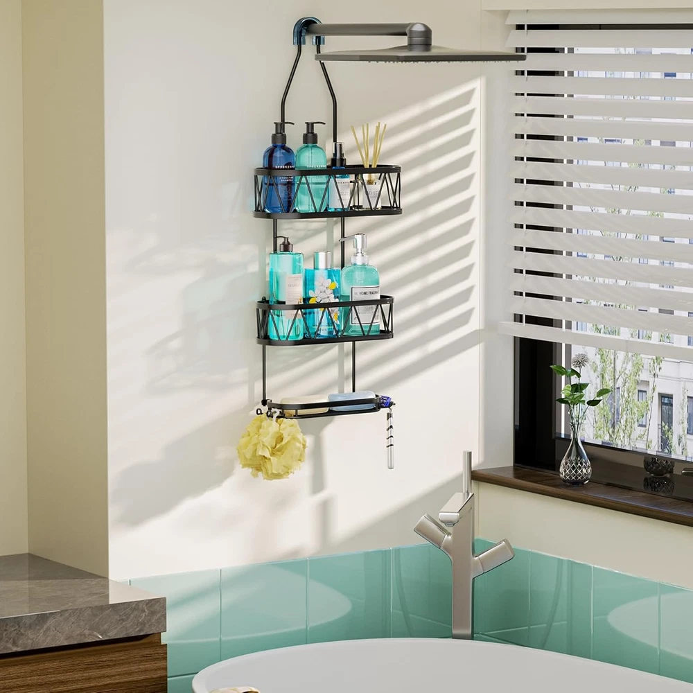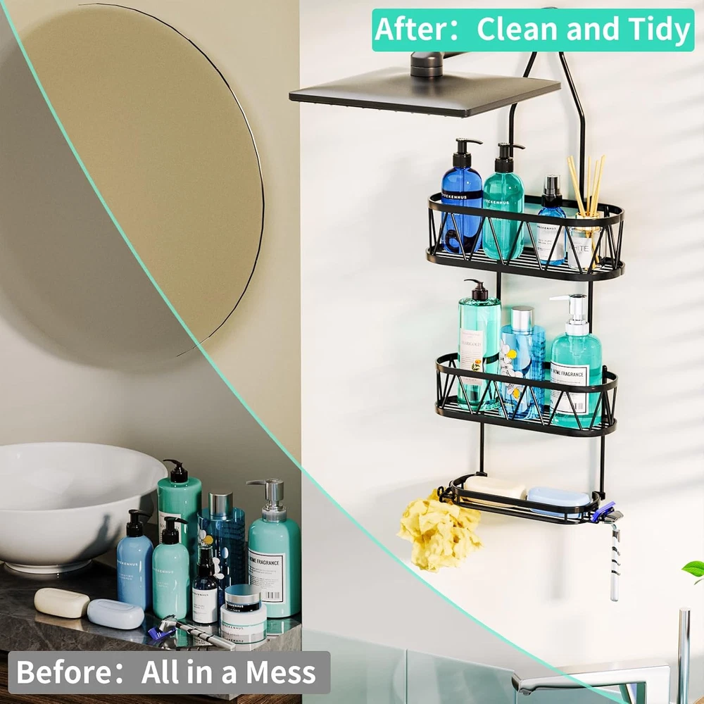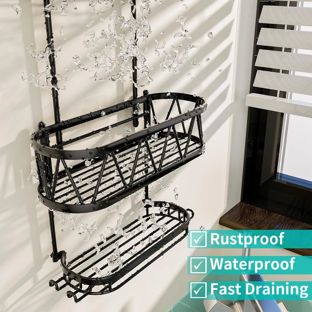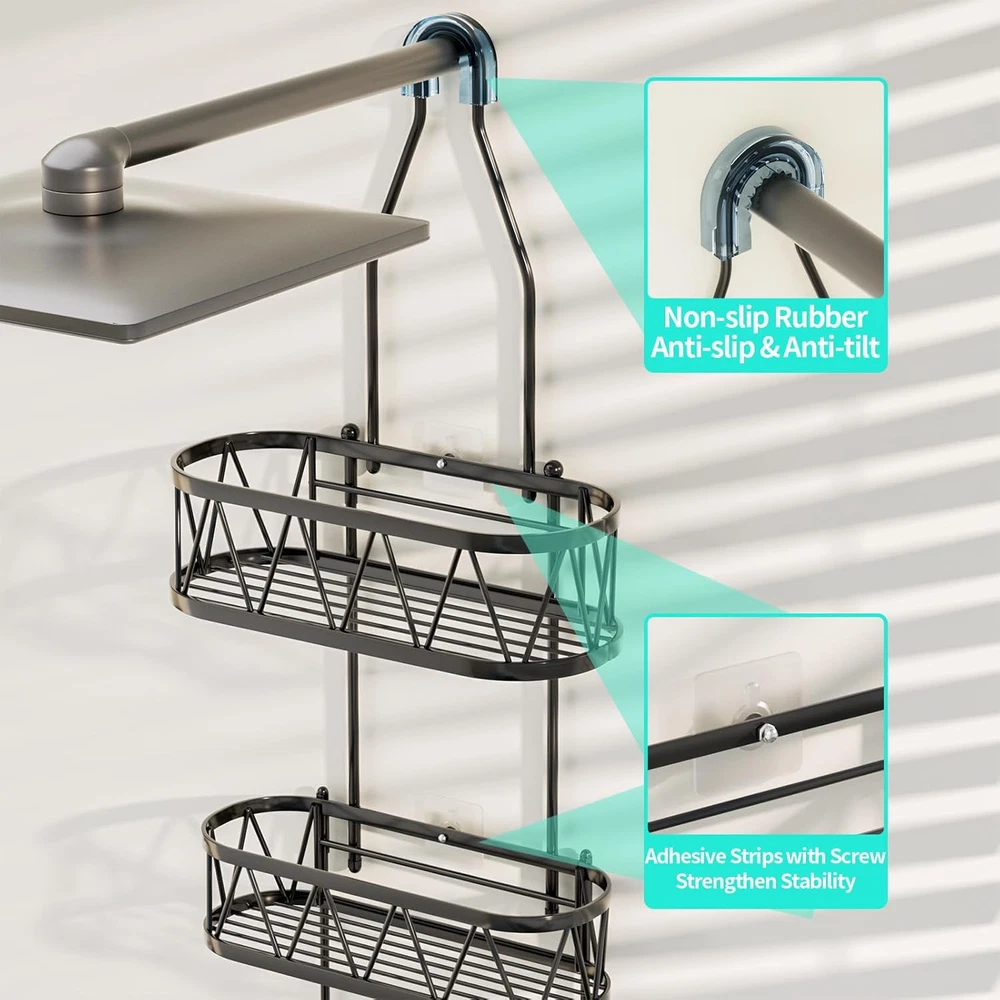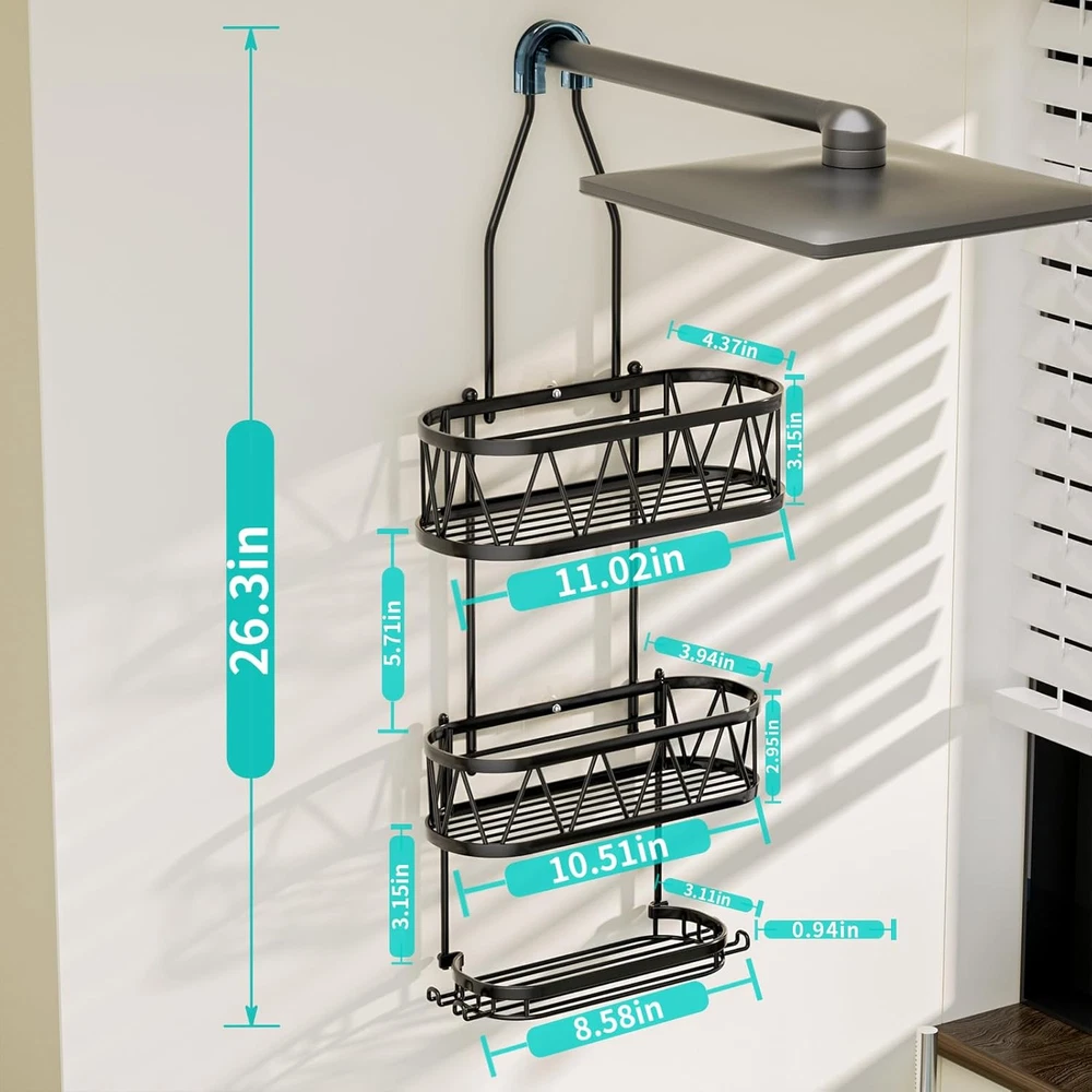HapiRm Shower Caddy over Head, 11.02*4.37*26.3 inches, A-Black Product Details Specific Uses For Product: Bathroom Accessories, Showers,Shower Head,Bathroom Material: Stainless Steel Special Feature: Waterproof, Mildew Resistant, Easy Installation, Rust Resistant, Space saving Color: A-Black Brand: HapiRm Finish Type: Polished Product Dimensions: 4.37"D x 11.02"W x 26.3"H Shape: Rectangular Capacity: 30 Pounds Package Type: Standard Packaging Number of Items: 1 Maximum Weight Recommendation: 30 Pounds Manufacturer: HapiRm Part Number: ZWJ88-B Item Weight: 1.87 pounds Country of Origin: China Item model number: ZWJ88-B Size: 11.02*4.37*26.3 inches Finish: Polished Item Package Quantity: 1 Special Features: Waterproof, Mildew Resistant, Easy Installation, Rust Resistant, Space saving Included Components: 1*hanging shower shelf, 4*adhesives (with screw) Batteries Included?: No Batteries Required?: No Specific Uses For Product: Bathroom Accessories, Showers,Shower Head,Bathroom Material: Stainless Steel Special Feature: Waterproof, Mildew Resistant, Easy Installation, Rust Resistant, Space saving Color: A-Black Brand: HapiRm Finish Type: Polished Product Dimensions: 4.37"D x 11.02"W x 26.3"H Shape: Rectangular Capacity: 30 Pounds Package Type: Standard Packaging Mounting TypeItem Weight: Hanging Mount1.87 Pounds Number of CompartmentsUnit Count: 31.0 Count [Stable Adhesive]: Equipped with the anti-slip rubber and strong adhesives, our hanging shower caddy firmly grips the wall, so it will not fall down easily. You can enjoy a comfortable shower experience with this hanging shower organizer [Durable Stainless Steel]: Made of 304 stainless steel, our shower caddy's appearance is low-key and luxurious, HapiRm shower caddy over showerhead has excellent drop-resistant durability design, can effectively prevent rust even in wet conditions [Fast Draining Shower Caddy Shelf]: Hollow design of the shower rack can quickly drain the moisture on the toiletries and shower shelves, keeping the bathroom clean and fresh, will be your most effective helper during bathing [Practical and Multiple Use Shower Storage]: Soap holder can elevate your shower experience as you don't need to find another place to put your soap. This practical hanging organizer will keep your shower essentials like soaps, body lotions well-organized [Compact Capacity Shower Shelf]: Measuring 11.02*4.37*26.3 inches, our bathroom caddy for shower is designed to save space in your bathroom. HapiRm shower caddy hanging can stores all the toiletries in one place, greatly reduces the occupation of bathroom [Practical and Considerate Hooks]: The 4 hooks of our bathroom caddy provide you shower storage so you can organize your shower tools well, using them to hang towels, razors, and so on. HapiRm shower organizer hanging keeps everything within reach [Effortless Installation]: Setting up the bathroom shower organizer has never been easier. Our bathroom shower caddy doesn't require any tools, and the clear installation process will have your space organized in no time [Professional Services]: If you are not satisfied with this hanging shower caddy over shower head, please consult our customer service staff. HapiRm after-sales service will be the shield of every customer
