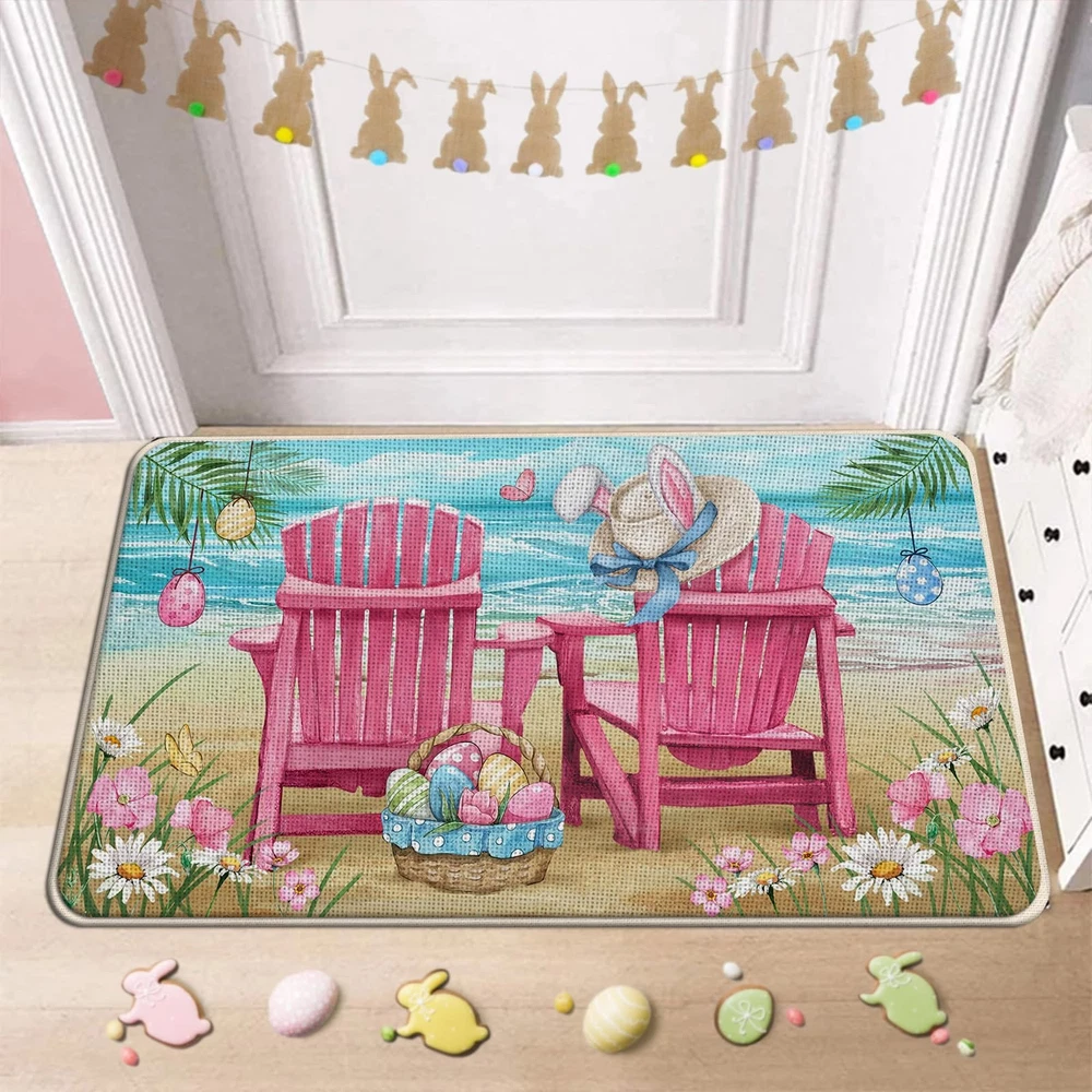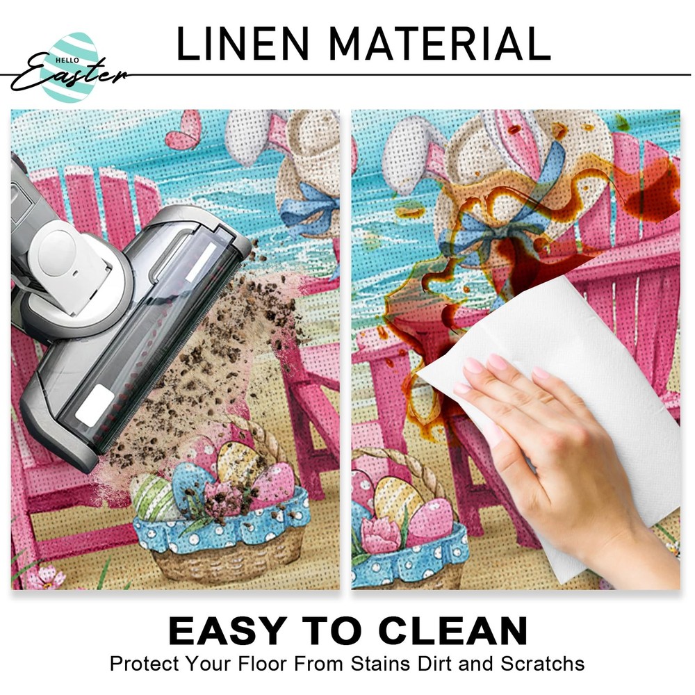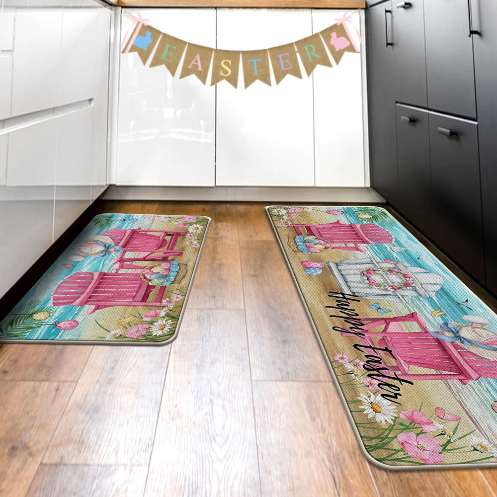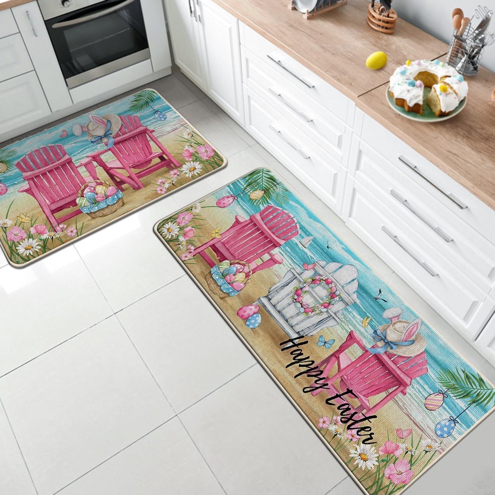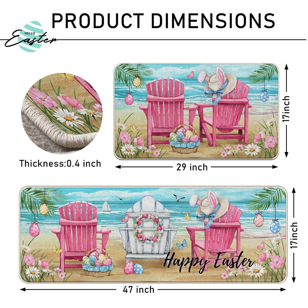 aims to uphold the core principles of high quality and helping customers. specializes in premium quality and stylishly designed home floor mats and rugs. Help customers decorate their dream houses. Durable and non-slip kitchen mat The anti-fatigue kitchen mat is designed with an attractive texture on the top, and the kitchen mat has a non-slip bottom to ensure the mat stays in place for added safety and stability. Water under the carpet may cause slippage, use it on a dry surface. Beautiful kitchen mat for home decor Our kitchen mats make a beautiful and warm addition to your kitchen, dining room, indoor entryways and craft rooms. This 2 pieces mats set is also suitable for outdoor entryways, balcony and office spaces. They are perfect mats set to brighten up your kitchen for less. Specifications: Material: Linen, rubber Color: Multi-color Set of 2:1PC 17" x 29" kitchen mat, 1PC 17" x 47" kitchen mat Notice: Due to manual measurement, the doormat size has an error of ±0.2. To keep it clean and beautiful, please clean it regularly. But please note that no machine wash is required, just rinse water. Attractive Unique Design: The Easter non-skid doormat top was printed with seashore, ocean, Adirondack chairs, eggs, basket, rabbit ears hat, daisy, tulip, Monstera, seagull, sailboat patterns and the words of "Happy Easter". Not only is it a beautiful and creative way to decorate your home, but it also brings you a deeply cheerful festive atmosphere Comfort Standing Kitchen Mat: This cushioned switch mat features non-slip recycled rubber on the back and low-profile linen felt on the top to reduce chances of tripping. Besides, the low-profile rug has a high-quality durable construction that effectively resists stains 2-Piece Kitchen Rug: There is a door rug and a long kitchen runner rug in the package, which measures 17" x 29" and 17" x 47". One short and one long make these padded mats (alfombra para cocina) be the perfect size for kitchen Perfect For Home Decor: The seasonal floor rugs are perfect for indoor kitchen, sink floor, living room, bathroom, office, laundry, foyer, entryway, doorway, outdoor, porch, deck, patio entrances, veranda, balcony, restaurant kitchen, holiday decor. Just place it anywhere you want. Add pop colors to decor your home and protect your floors, too Easy To Clean: Cleaning of kitchen carpets is quick and easy, just spray with a hose or use a sponge and mild detergent to remove dirt. Do not bleach or dry clean, do not wring and let it air dry. Our washable kitchen rugs are rigorously tested to ensure they last for a long time and retain their shape after washing