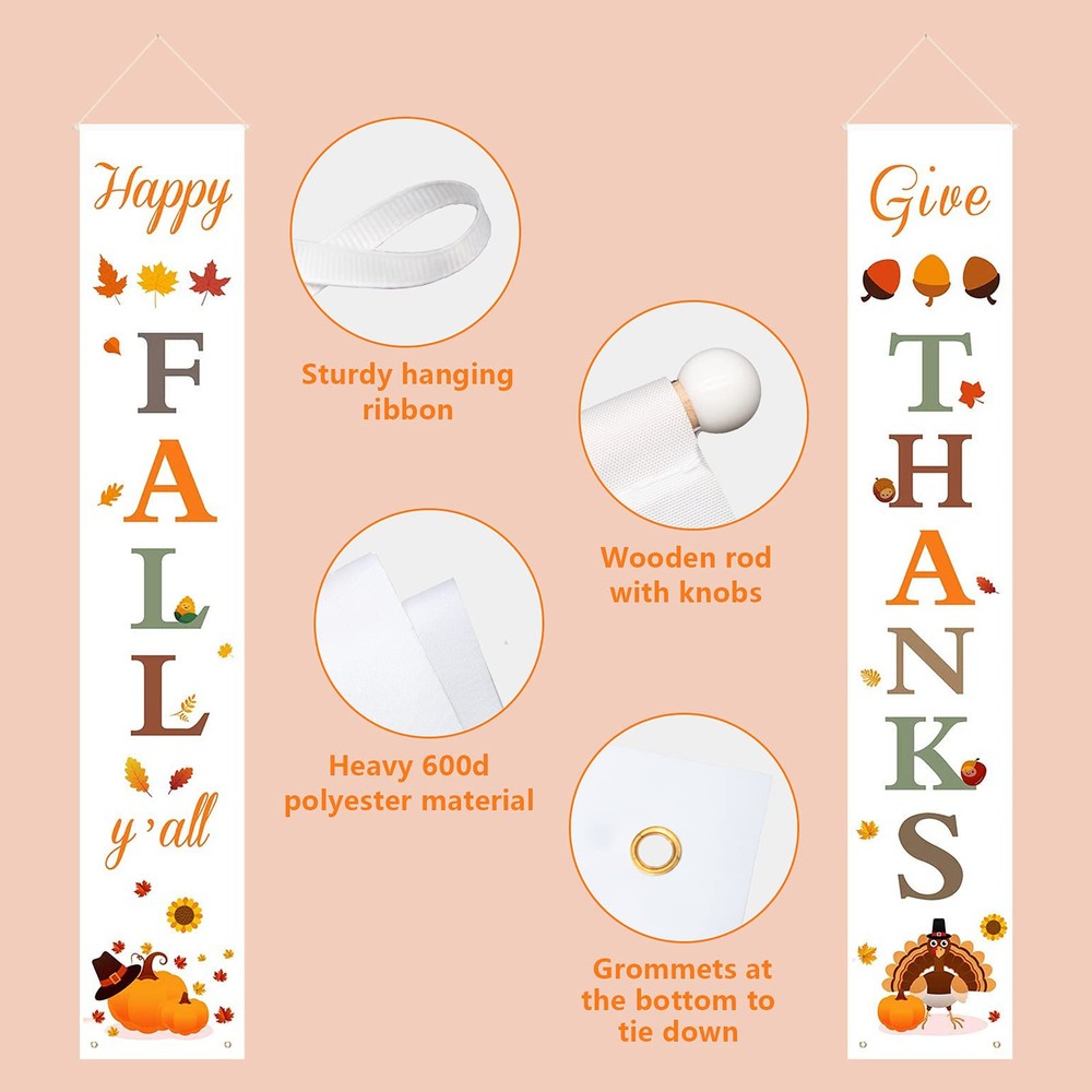 🍁 Versatile Thanksgiving Banner -- An easy but festive way to greet your guests and dress up your front door for Fall harvest season, adding warm hues and natural charm to your outdoor harvest decorations. 🍁 Rustic Fall Thanksgiving Decorations for Home -- The porch signs feature Happy Fall Y’all and Give Thanks Lettering with festive designs of leaf, acorn, pumpkin and turkey that make the fall colors truly pop and stand out. 🍁 Highly Durable Material -- Made of heavy duty fabric, sturdy, weather-resistant and easy to for future uses. Pre-assembled and ready to décor your home or office. 🍁 Decent Size -- Each banner measures 70"H x 13"W, fits perfectly indoor or outdoors and easy to hang on front door, porch, foyer, garage, or patio, or gracing an entryway! In addition, there are 2 grommet holes at the bottom to secure them against the wind. 🍁 Complete Your Thanksgiving Decorations -- Keep this decorative fall sign for your own home or give it as a gift to family and friends who enjoy fall décor accents for their own decorating needs.