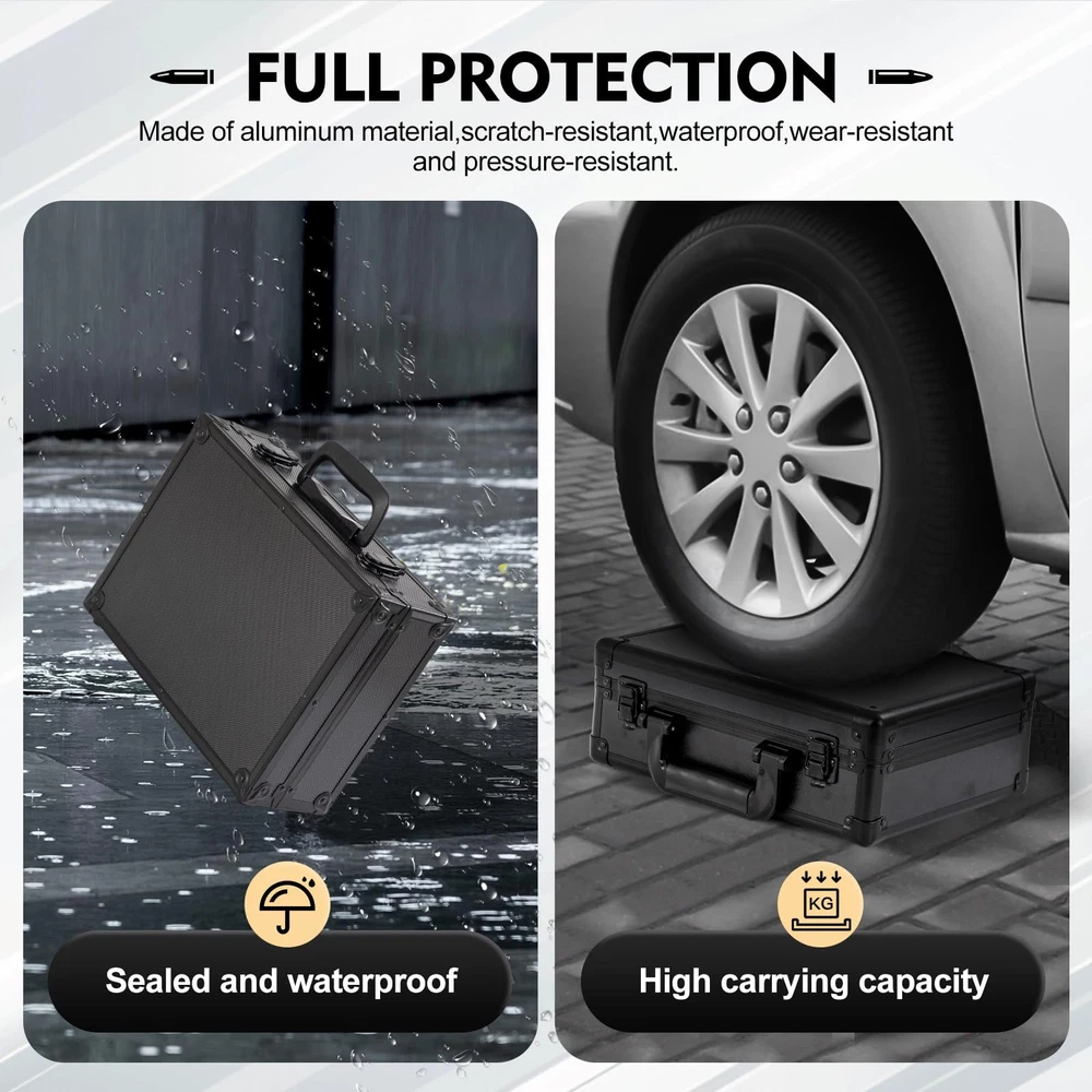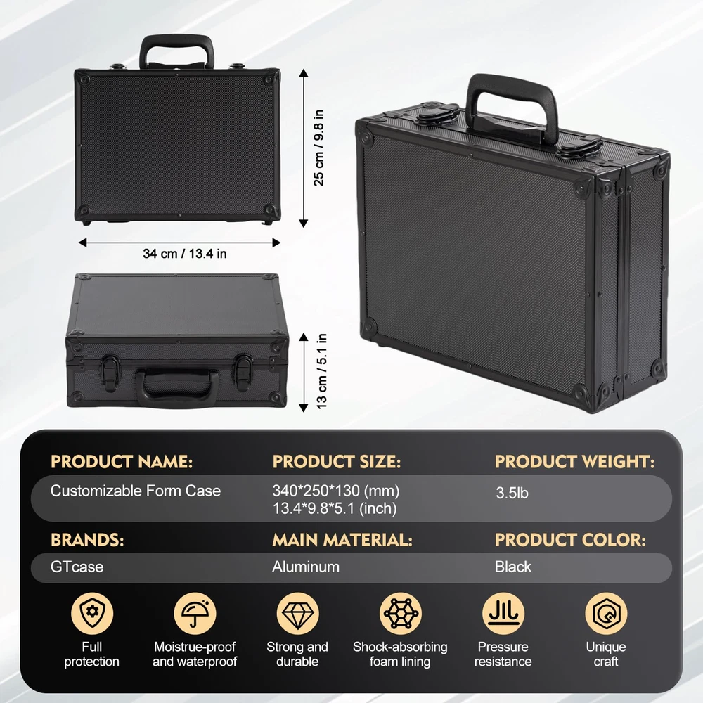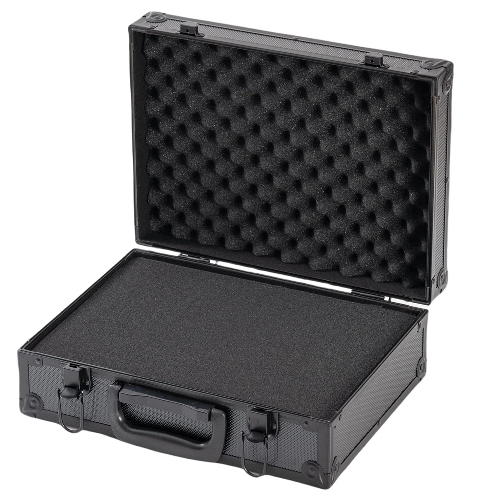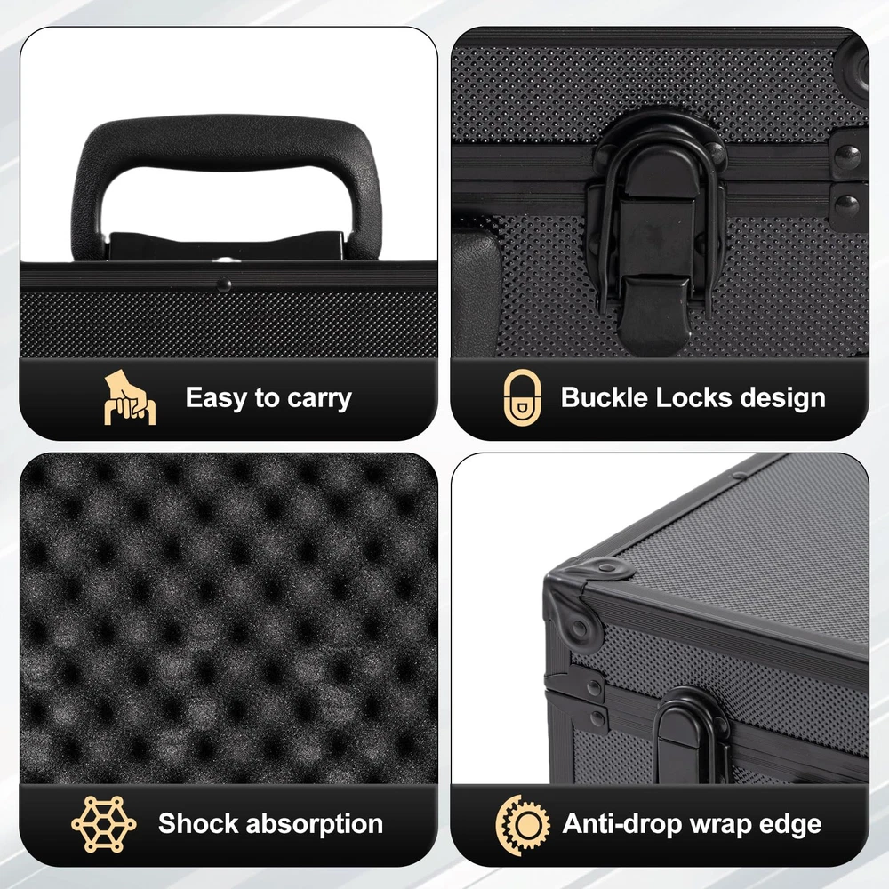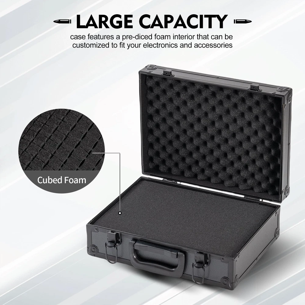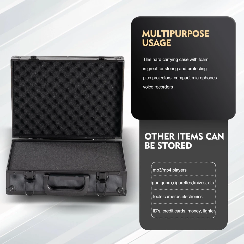 Description Hard-shelled protective case for storing and transporting firearms, compact cameras, GoPro cameras, accessories and more. Product Size :Internal Case Dimensions: 12.6" x 9" x 3"; External Dimensions: 13.4" x 9.8" x 5.1" This mic case features a hard shell exterior constructed from durable aluminum that will provide impact-resistance to your valuable contents.Portable Soft Grip Handle:Easy to go with our portable handle design . Beautiful and Functional Injection Molded. Durable use with the solid construction. [CUSTOMIZABLE FOAM INTERIOR]: This protective travel case features a pre-diced foam interior that can be customized to fit your electronics and accessories. Just remove pre-diced blocks of foam to create the perfect storage for your items Protective travel case compatible with mini projectors, compact microphones, voice recorders, action cameras and many more compact electronic devices