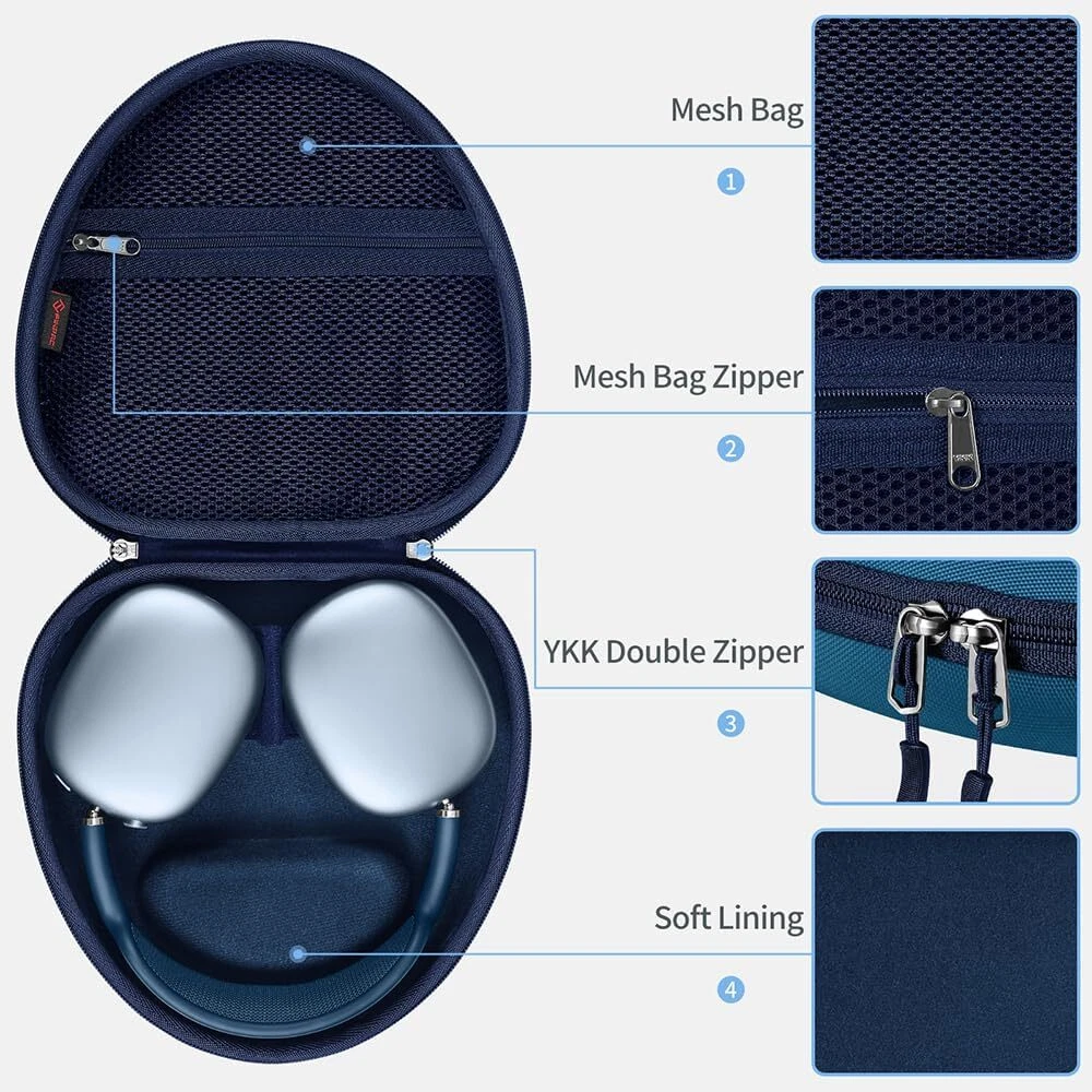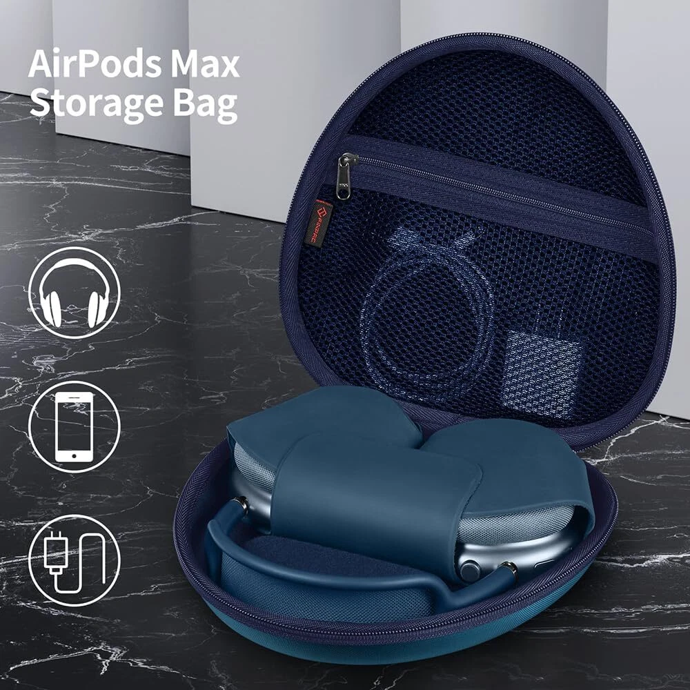 Home Payment Shipping Return Policy About Us Contact Us Feedback Hard Case for AirPods Max Headphone Travel Carrying Storage Bag Auto Wake/Sleep 【Special Design】Specifically designed for AirPods Max Headphone. Interior size: 8.2*7.9*2.7 in, Exterior size: 9.1*8.3*2.4. (Device and accessories are not included). 【Auto Sleep / Wake】Built-in velcro tab with magnets, when you put the AirPods Max in or out, the Bluetooth can be automatically disconnected (Auto Sleep) or connected (Auto Wake). Ultra-low-power mode immediately to preserve battery charge. 【More Organized】This hard case includes the perfect mesh pocket with YKK zipper for your cables, cords, chargers,earpads, adapters, ID card or any other accessories. 【Full Protection】Hard EVA exterior and soft lining interior case to bring AirPods Max from knocks, impacts, bumps, drops, spills, scratches, dust and water. Keep your AirPods Max safe. 【Easy to Carry】Comfortable hand strap is lightweight and compact, can fit in your bag, backpack, or luggage. Convenient, durable perfect for travel, the gym, or your commute to take anywhere.