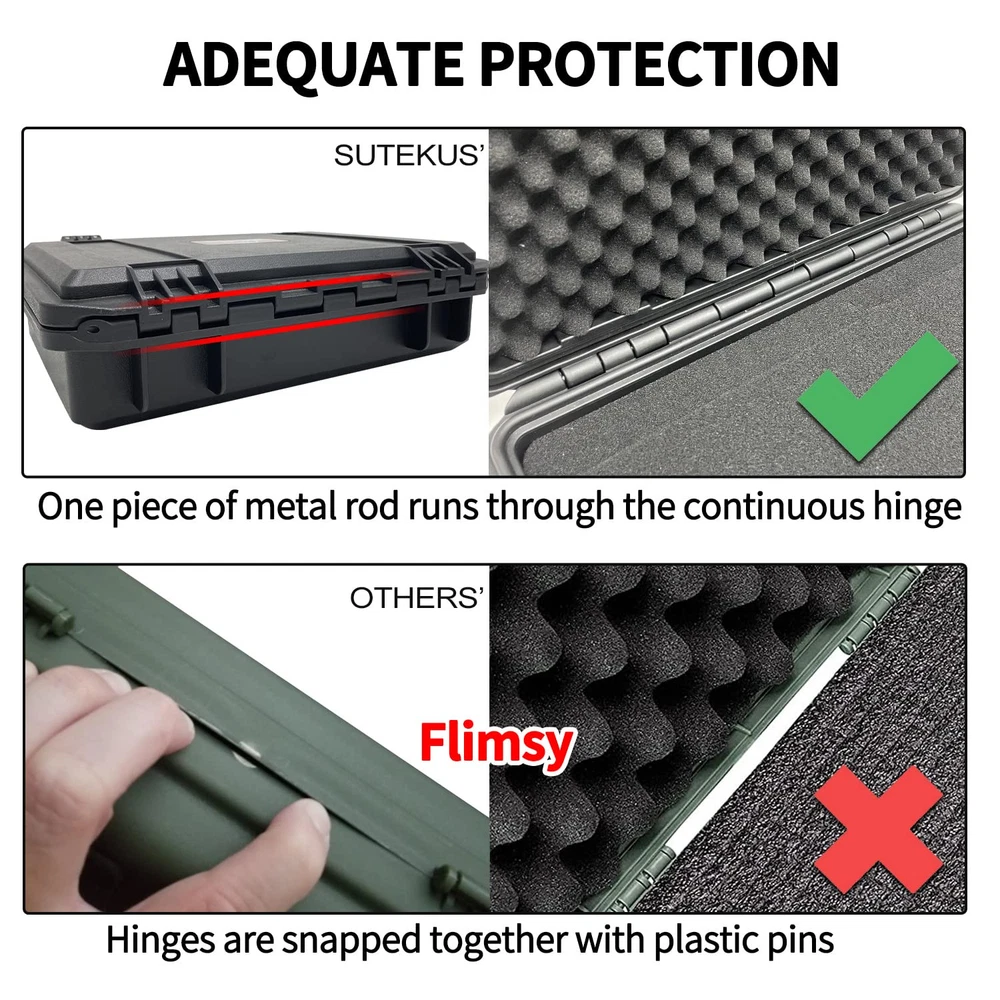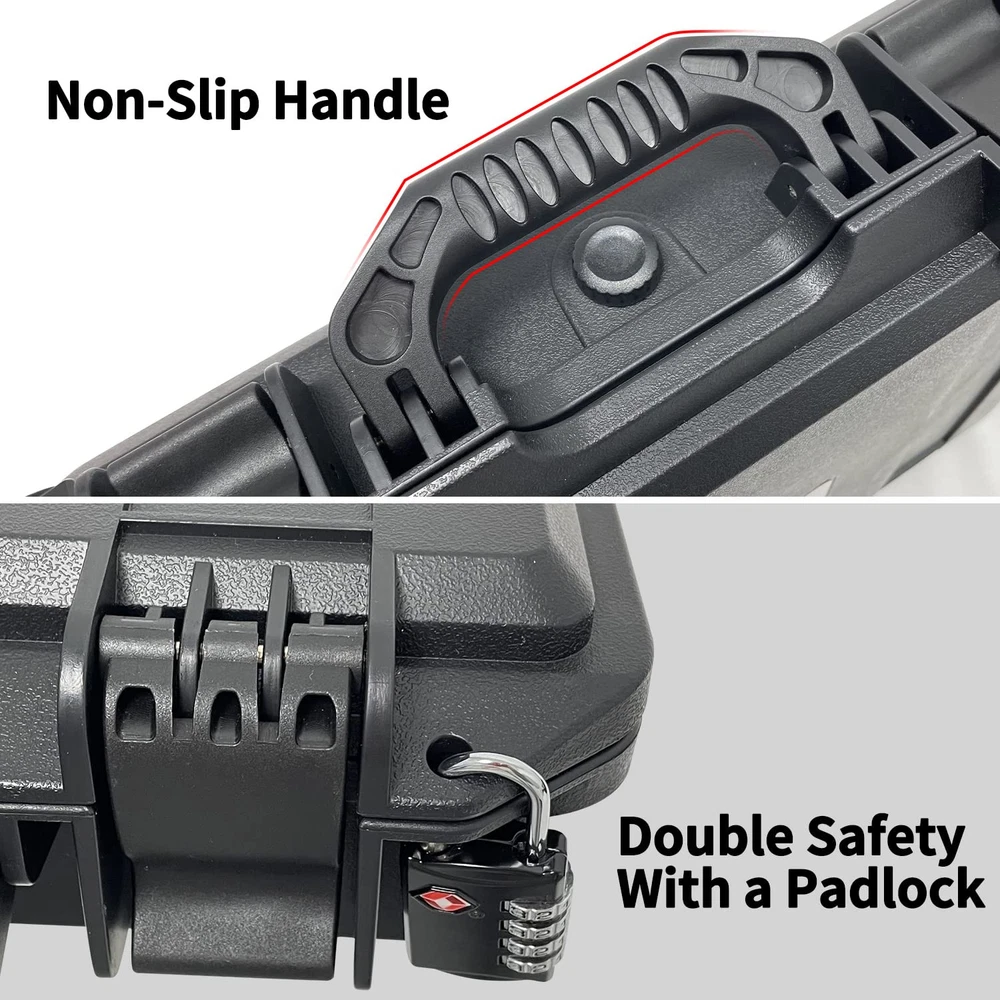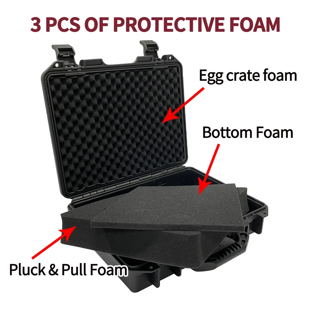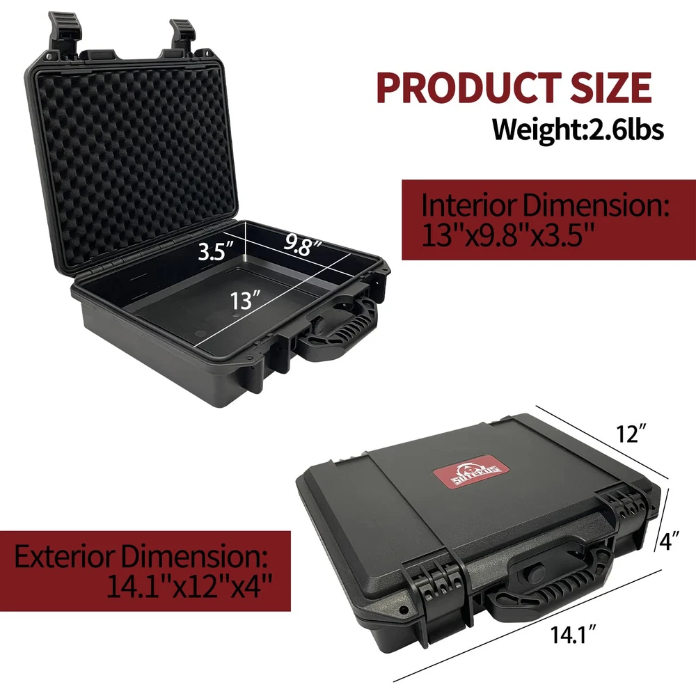 Exterior Dimensions: 14.1"x12"x4", Interior Dimensions: 13"x9.8"x3.5". Weight: 2.6lbs. Please read the size before purchasing. Equipped with secure, lockable latches, and a large molded-in handle. Lockable and Waterproof. Stackable Design. 3 layers of high-density protective foam - 1 top egg crate layer, 1 layer of thick pluck & pull foam and 1 layer of bottom foam. Pressure equalization valve allows for the release of air when changing altitudes. Perfect protective case for storing and transporting pistols, small drones, compact cameras, GoPro cameras and more.