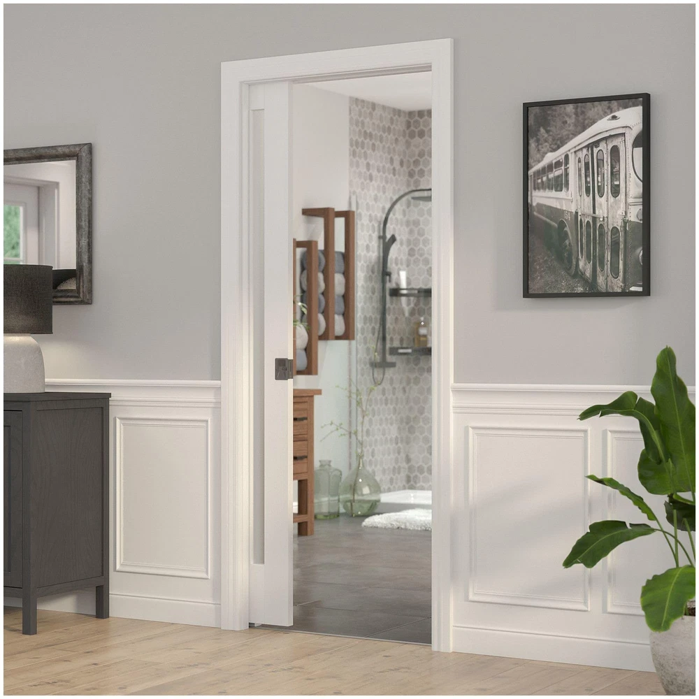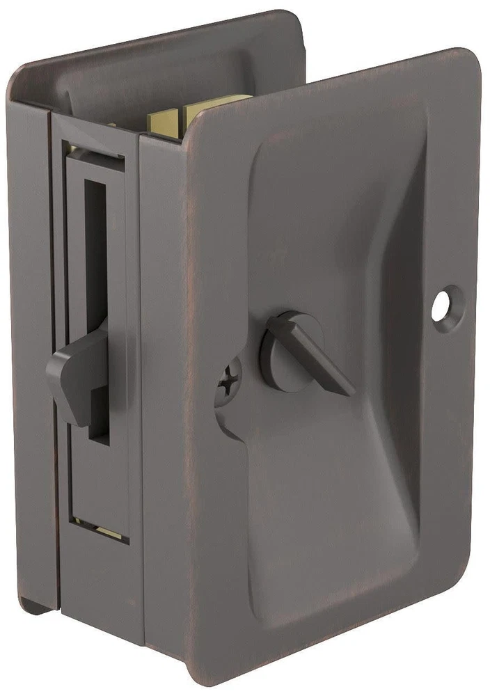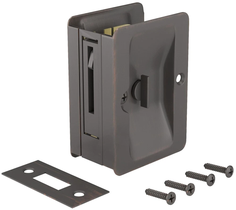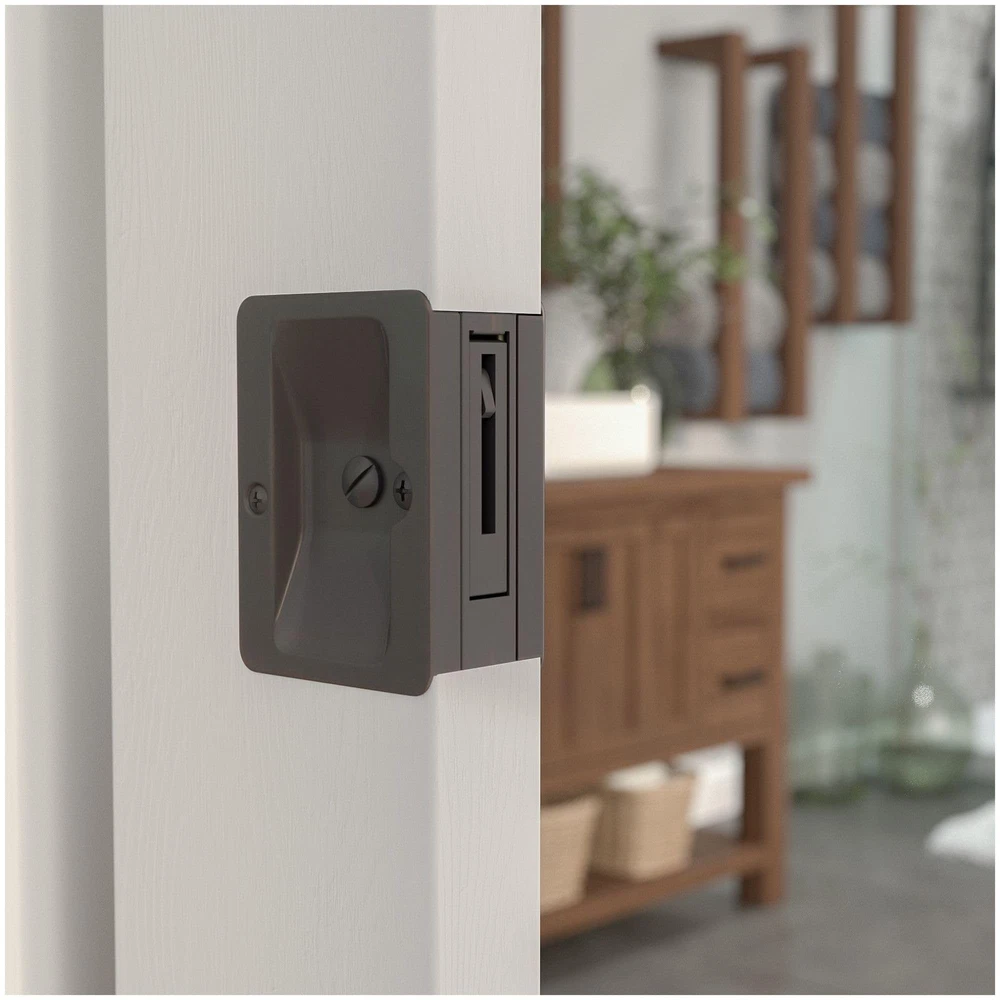 The Onward Pocket Door Pull with lock is the ideal solution for bedrooms, bathrooms, and anywhere you need privacy in your home. Designed for use with pocket doors and most types of sliding doors, this rectangular pull is practical and sleek, blending seamlessly into any decor. Made of robust steel that’s smooth to the touch, it features a latch you can use to pull the door closed and keep it securely shut. The Pocket Door Pull with privacy lock is with left- and right-handed doors and is adjustable to fit different door thicknesses. Screws are included for easy installation. Mounting hardware is included for an easy installation with left-hand and right-hand doors Door Thickness: 1" 1/4 in to 1" 1/2 in (31.8 mm to 38.1 mm) Height x Width: 3" 7/32 in (82 mm) x 2" 9/32 in (58 mm) Screws and nails included