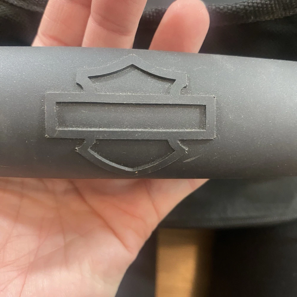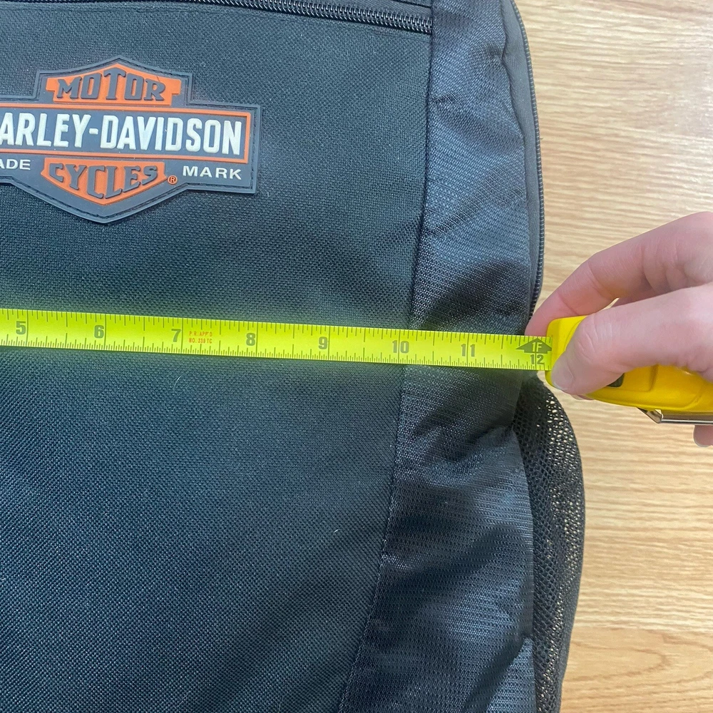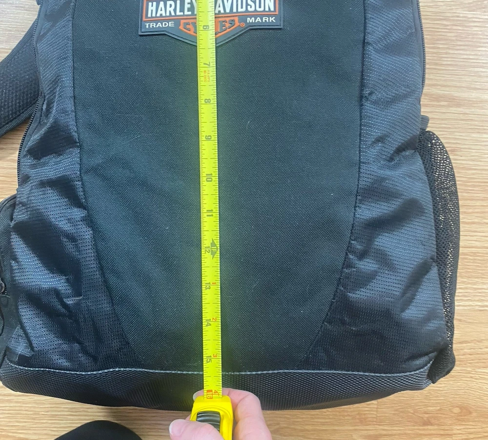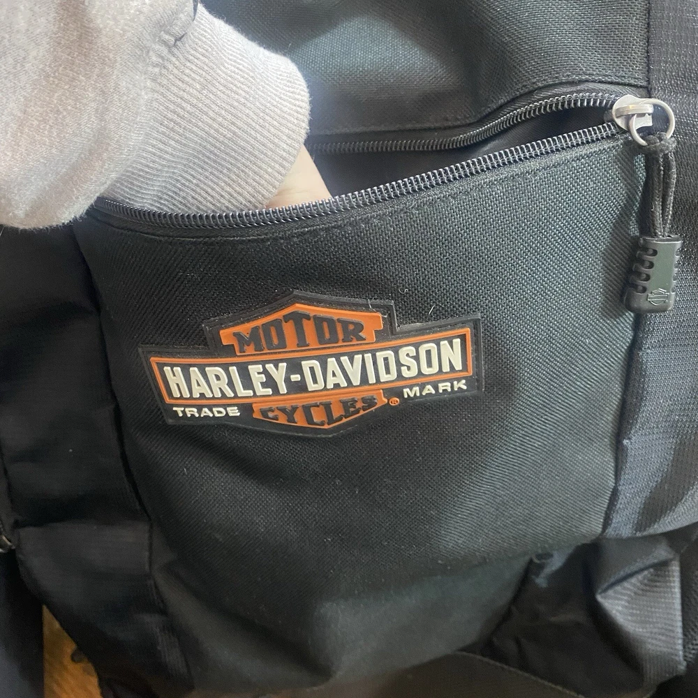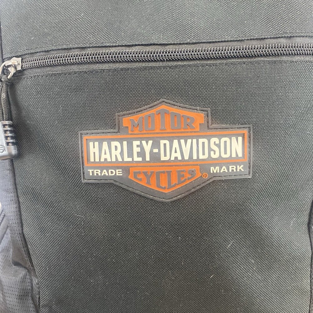 This Harley-Davidson Motorcycles Backpack in black ideal for travel, casual or business use. The large size backpack is made of canvas with a zip closure, shoulder straps, and laptop sleeve. It includes multiple outer pockets, bottle pocket, and adjustable straps, making it lightweight and packable. Perfect for motorcycle enthusiasts or bikers. Used approximately 3x.