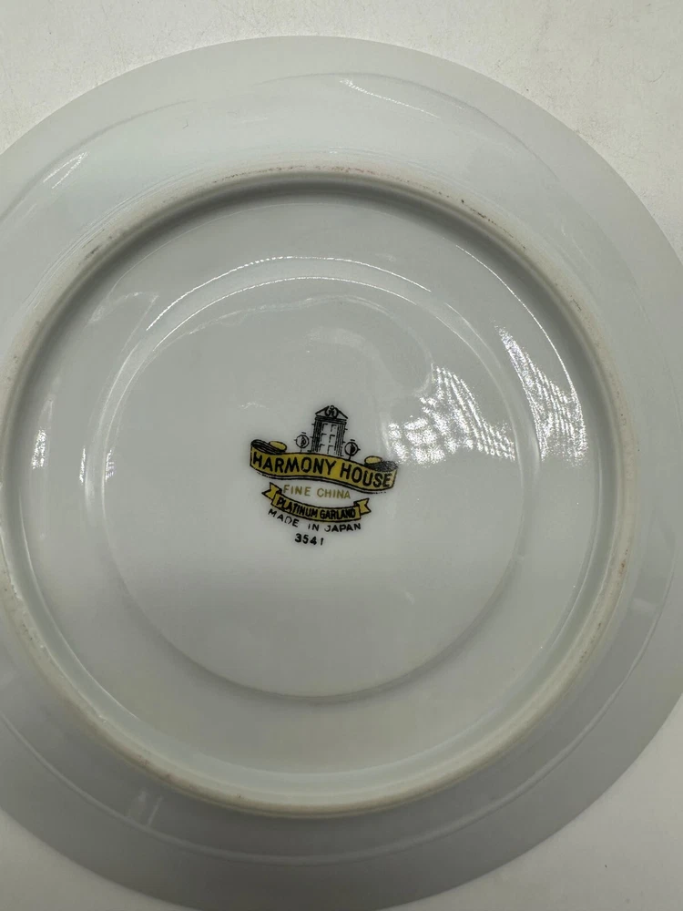 This set includes 3 vintage Harmony House Platinum Garland teacups and saucers made of silver bone china. The design is embossed with a Victorian style and a theme of magic. Each teacup has a 6-ounce capacity and features a decorated pattern. This original set, manufactured in the 1950s in China, is a beautiful addition to any tea lover's collection.
