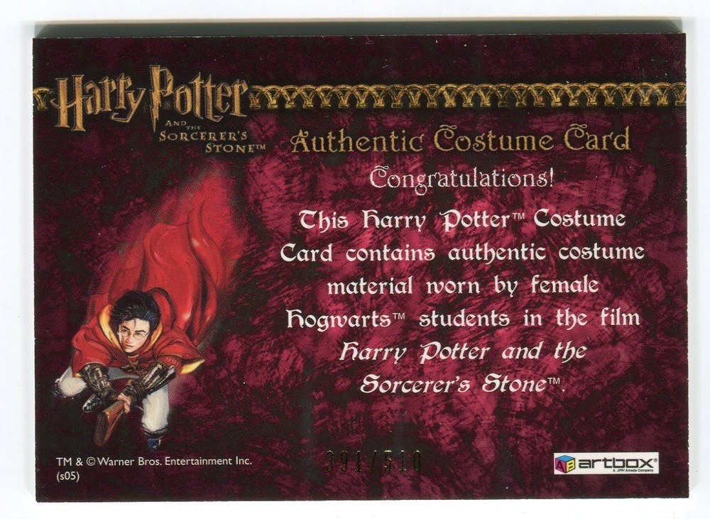 Description: Harry Potter and the Sorcerer's Stone Female Hogwarts Students Costume Card Contents: Authentic Limited Edition Costume Card (#391/510) featuring costume material worn by the Female Hogwarts Students in the film Harry Potter and the Sorcerer's Stone. Manufacturer: Artbox Entertainment, 2005.
