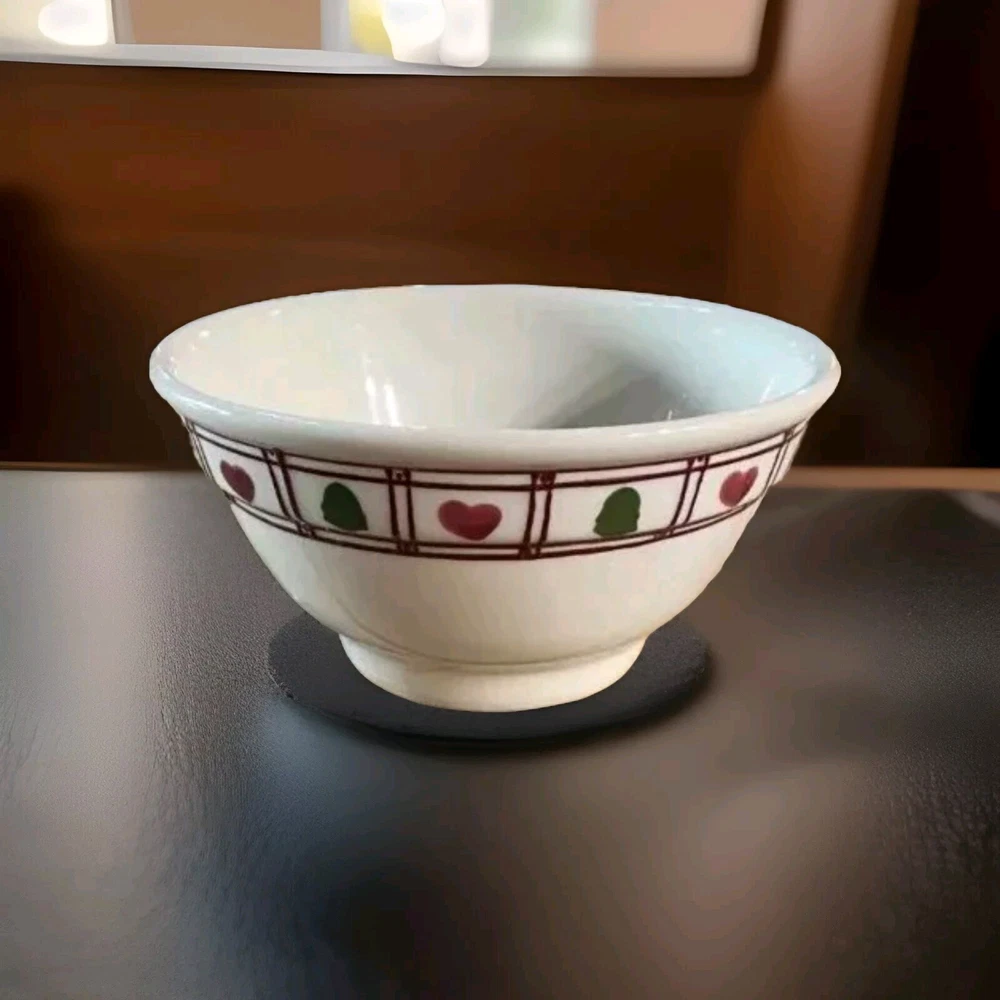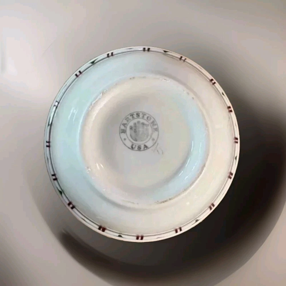 Add a touch of American style to your decor with this beautiful Hartstone bowl. Handmade in Ohio, this round bowl features a lead-free glaze with a hearts and trees pattern in multicolor. Perfect for holidays, Christmas, winter, all occasions, and Valentine's Day, this bowl is oven, microwave, dishwasher, and hand painted. It is also stackable and decorative, making it a great addition to any collection. Crafted from clay and stoneware, this 4" in diameter and 2.5" in depth bowl is an original from the 21st century. It is perfect for teens, boys, girls, and adults, and weighs 2 lb. The bowl is part of the Hartstone product line, and its production technique is pottery. It comes with a painted backstamp and is a great gift for any occasion.