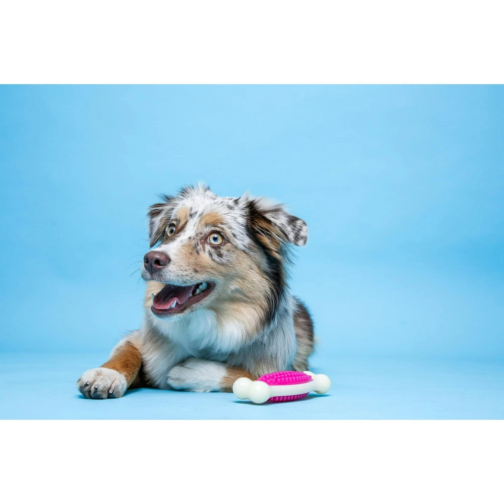 Hartz Chew 'n Clean Tuff Bone, Dental Dog Chew Toy, Medium, Color May Vary (Pack Of 6) Hartz Chew ‘n Clean Tuff Bone satisfies your dog's natural desire to chew. These durable chew toys are textured with nubs that gently massage and exercise your dog's gums, keep teeth clean, and support overall better dental hygiene. These chew toys have a bacon scent to entice your dog to chew while promoting those dental benefits. About this item This patented design is assembled from durable nylon and polyurethane with a textured surface to withstand active chewing from both puppy teething and adult dogs The nubs gently massage your dog's gums and help to clean teeth by keeping tartar and plaque at bay Enticing bacon-scented chew toy to pique your pup's interest and support their natural desire and behavior to chew Always select toys appropriate for your dog's size and chewing habits and be sure to supervise your pet's chew and playtime. Additional Chew ‘n Clean Dog Chew Toys available are bacon-scented Twisty Bones for mild to moderate chewers and Dental Duos for a toy & bacon flavored dental treat all in one Chew ‘n Clean Tuff Bones are perfect for puppies teething and mild to moderate chewing for adult dogs. Chew ‘n Clean Tuff Bones are available in a range of different sizes to fit every dog's chewing needs!