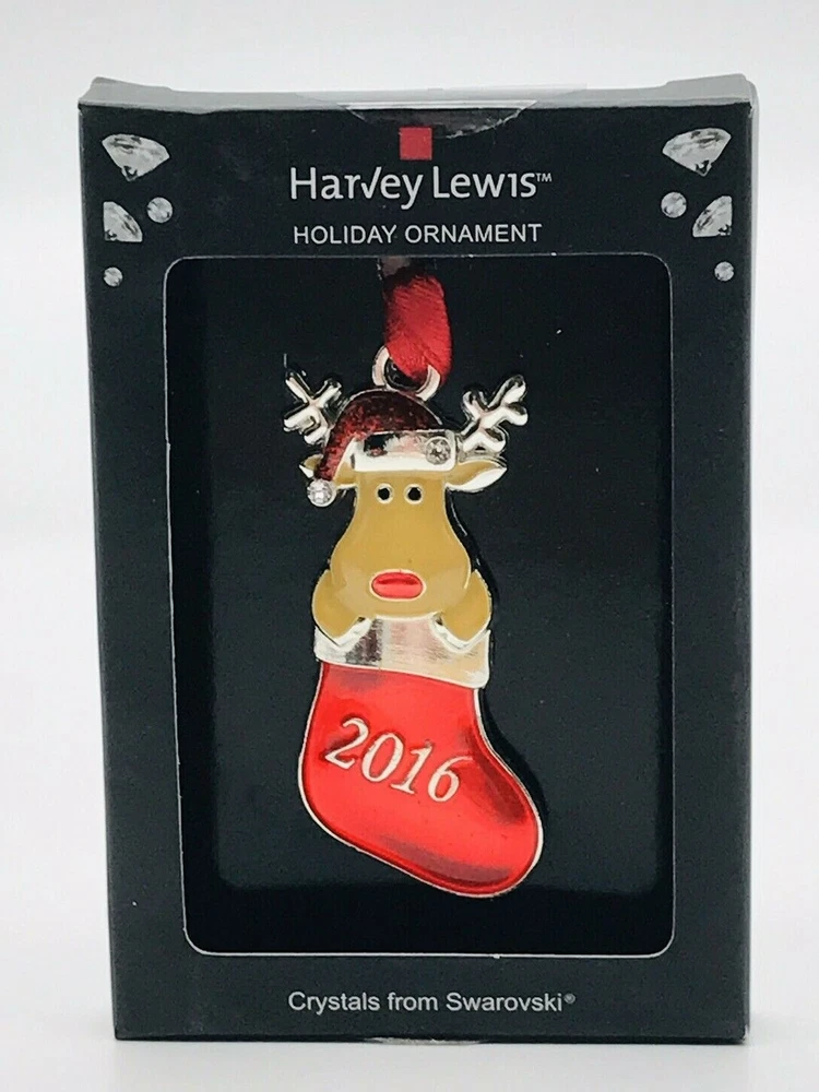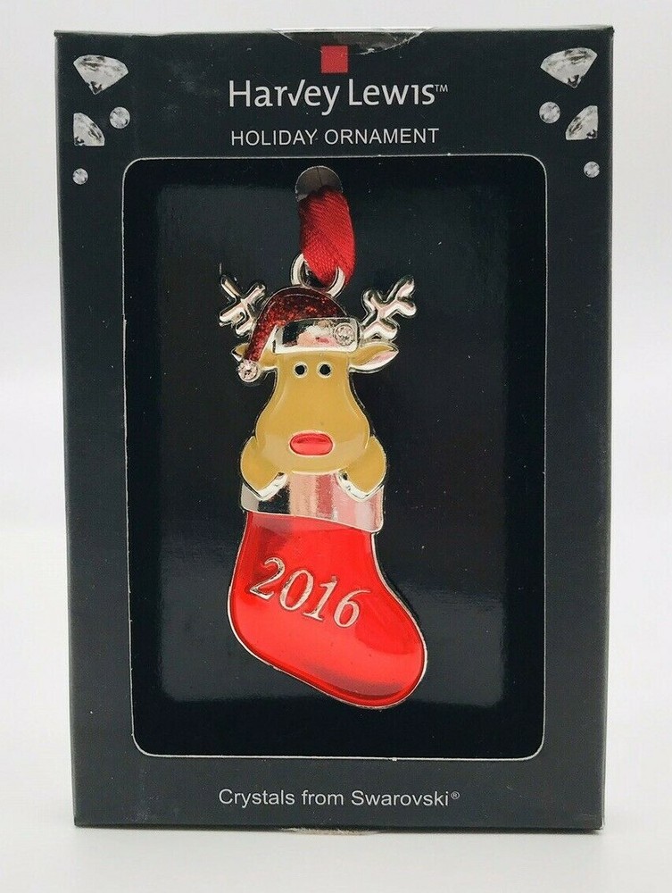 Harvey Lewis Mini 2016 Reindeer in Stocking Christmas Ornament Swarovski Crystal APPROXIMATE MEASUREMENTS: 2.5" TALL NOT INCLUDING RIBBON HANGER 1.5" ACROSS Thanks for looking… Please review photos closely. Please contact me with any questions you have. 1232