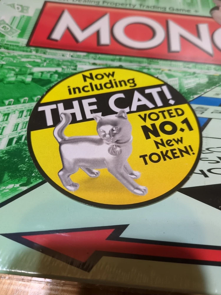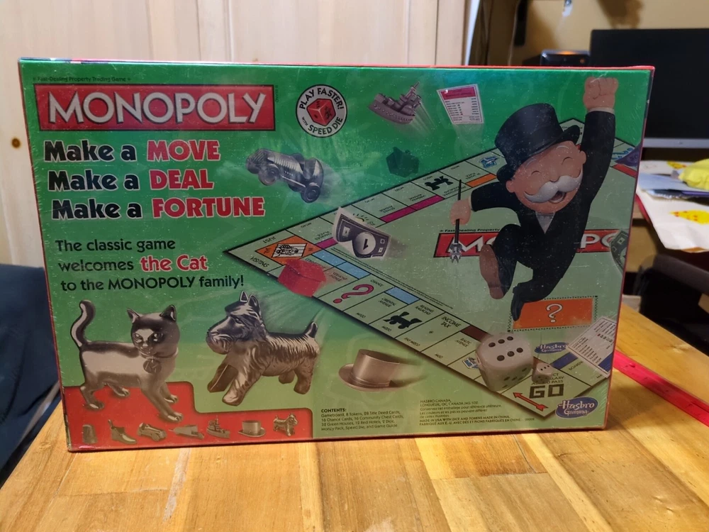 The product is a Hasbro Monopoly Classic Board Game from 2014 featuring the Cat character. It is a giant game version suitable for 2 players or more, with a finance theme. The game is designed for ages 8 and up, with a focus on strategic gameplay involving buying, selling, and trading properties. The game is brand new and still sealed in its packaging.