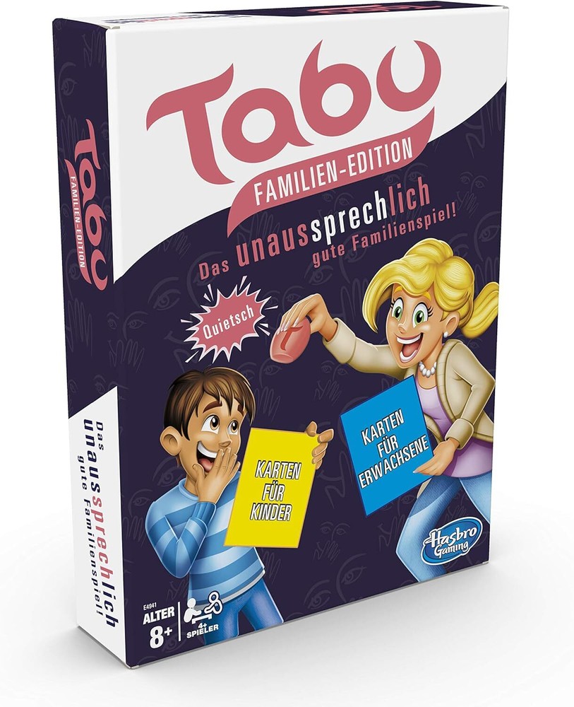 Further Details Title: Hasbro Taboo Kids vs. Parents Children & Adults Condition: New Brand: Hasbro Gaming Material: Plastic Theme: Trivia Release Date: 01/01/2020 Age Level: 8 years and up Min. Number of Players: 1 Item Length: 51mm Item Width: 200mm Item Height: 267mm Type: Board Games MPN: 315-E4941100 Description: Hasbro compatible Tabu Familien Edition E4941100 Item Weight: 200g Color: Multicolor Language: French, German Age Level: 8+ Hasbro TABOO - Tabu Familien-Edition, Brettspiel ab 8 Jahren Missing Information? Please contact us if any details are missing and where possible we will add the information to our listing.