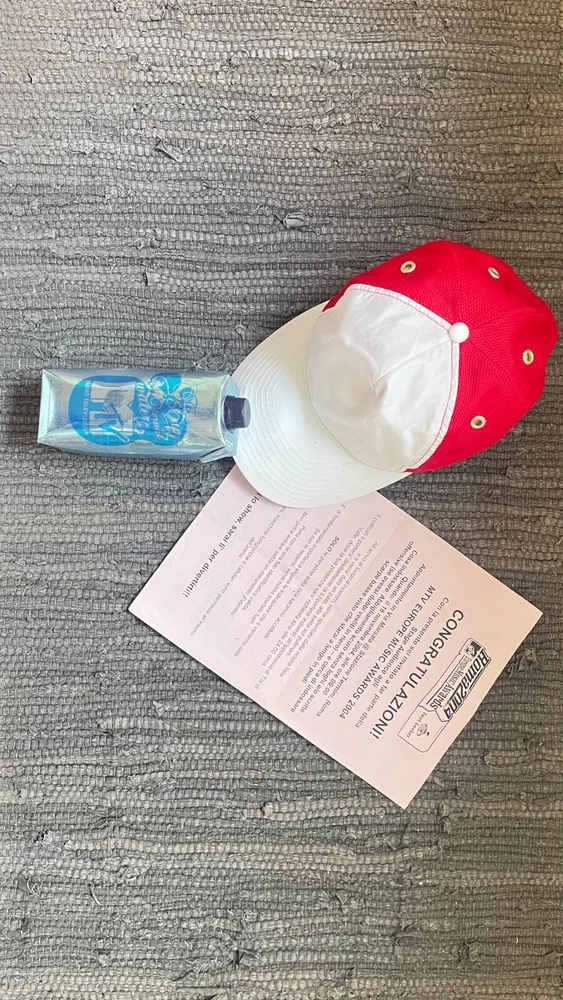 Limited Collection: MTV Europe Music Awards 2004. Collector's Item: MTV Europe Music Awards 2004. These authentic pieces, directly from the 2004 Rome event, are highly sought-after. The hat "beechfield" worn for the choreography on Eminem's piece " Just Lose It " , promotional water bottle (which was distributed at the event), and official event invitation a tangible connection to a legendary night in music. Perfect for any music fan or collector, A must-have for any memorabilia collection. The hat was not worn only that night, the water brick is used. ______________________ Collezione limitata: MTV Europe Music Awards 2004. Questi oggetti, provenienti direttamente dallo storico evento del 2004 a Roma, sono estremamente rari. Il cappello "beechfield" indossato per la coreografia sul pezzo musicale " Just Lose It " di E minem , il brick dell'acqua e la lettera di invito all'evento sono una testimonianza tangibile di una serata indimenticabile. Un'opportunità unica per possedere un pezzo di storia musicale. il cappello non è stato indossato solo quella sera, il brick di acqua è usato.