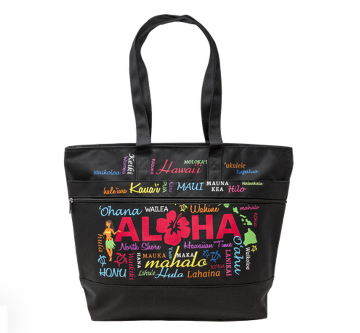 Hawaii Exclusive Tote Bag Island Accent Tote Bag: Words of Aloha - Black This Hawaii Exclusive Tote Bag by Hawaii Accent is a medium-sized reusable shopping bag made from light and strong nylon fabric. The bag features a modern design with tropical prints in black color. The tote bag is adorned with the words of Aloha, making it a stylish and functional accessory for everyday use. Tote measures 19" x 14" x 5"(bottom). Zipper closure, two front slide pockets, and two front zip pockets, and a small interior zip pocket. Fast shipping. Purchase with confidence from a trusted eBay seller! Shipped with USPS Ground Advantage 2-5 Business days..